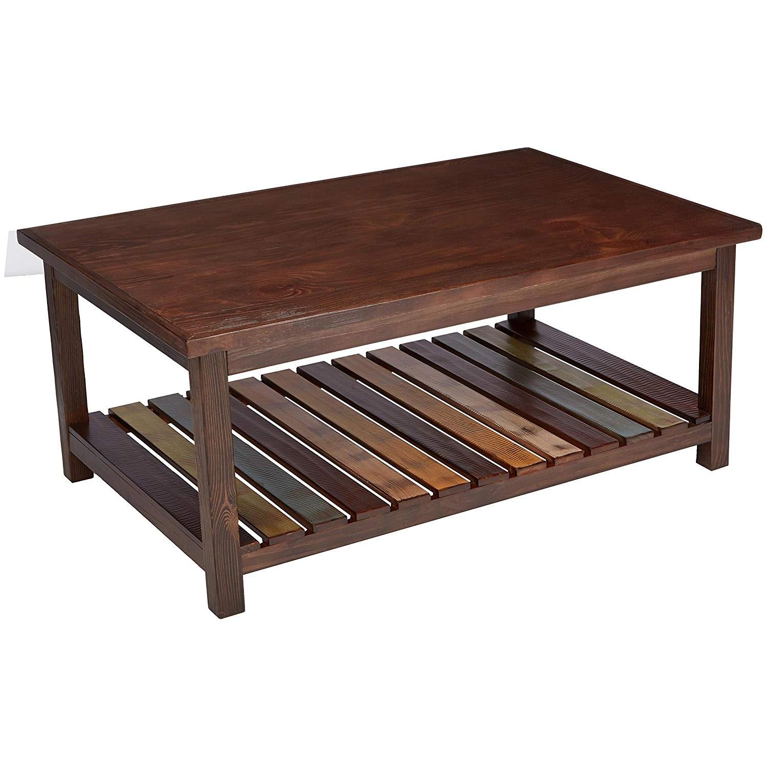 Seller's Notes:RUSTIC CHIC COCKTAIL TABLE: Rectangular coffee table with a reclaimed look is the perfect fit for any rustic or vintage-style living room. Features a slatted lower fixed shelf & sculpted edge details NATURAL WEATHERWORN LOOK: Coffee table crafted from veneers, wood and manmade wood RICH EDGE TREATMENT: Overall hand-applied finish with multi-tonal slatted lower shelf SCULPTURAL FORM: Rectangular coffee table measures 42" W x 28" D x 18" H. Shelf opening Width-39.25 inch. Depth-25.25 inch. Height-10.50 inch