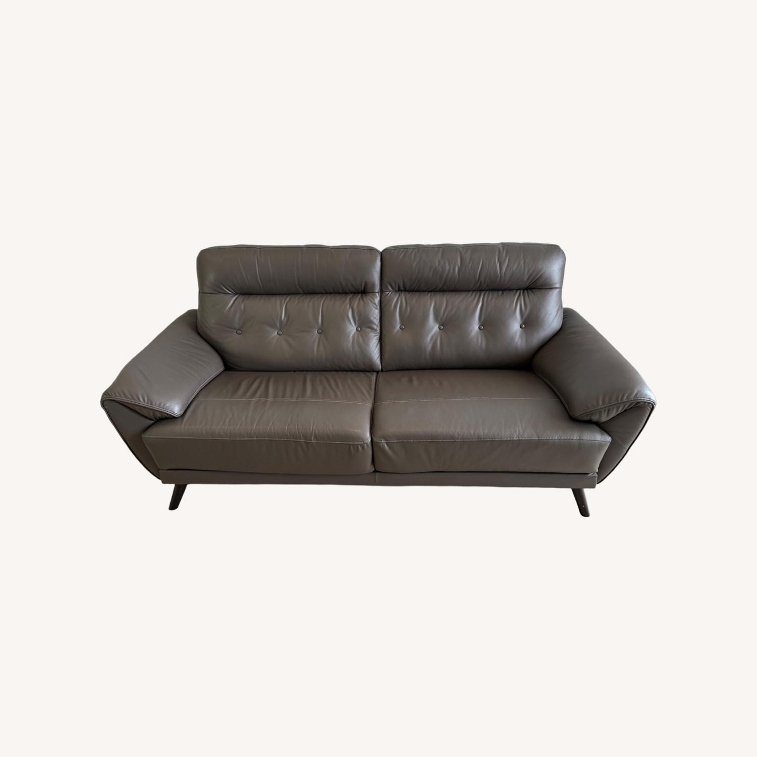 Seller's Notes:Gray, genuine leather sofa in like new condition. Firm feel, clean profile, and modern styling make it a perfect fit for designer interiors.