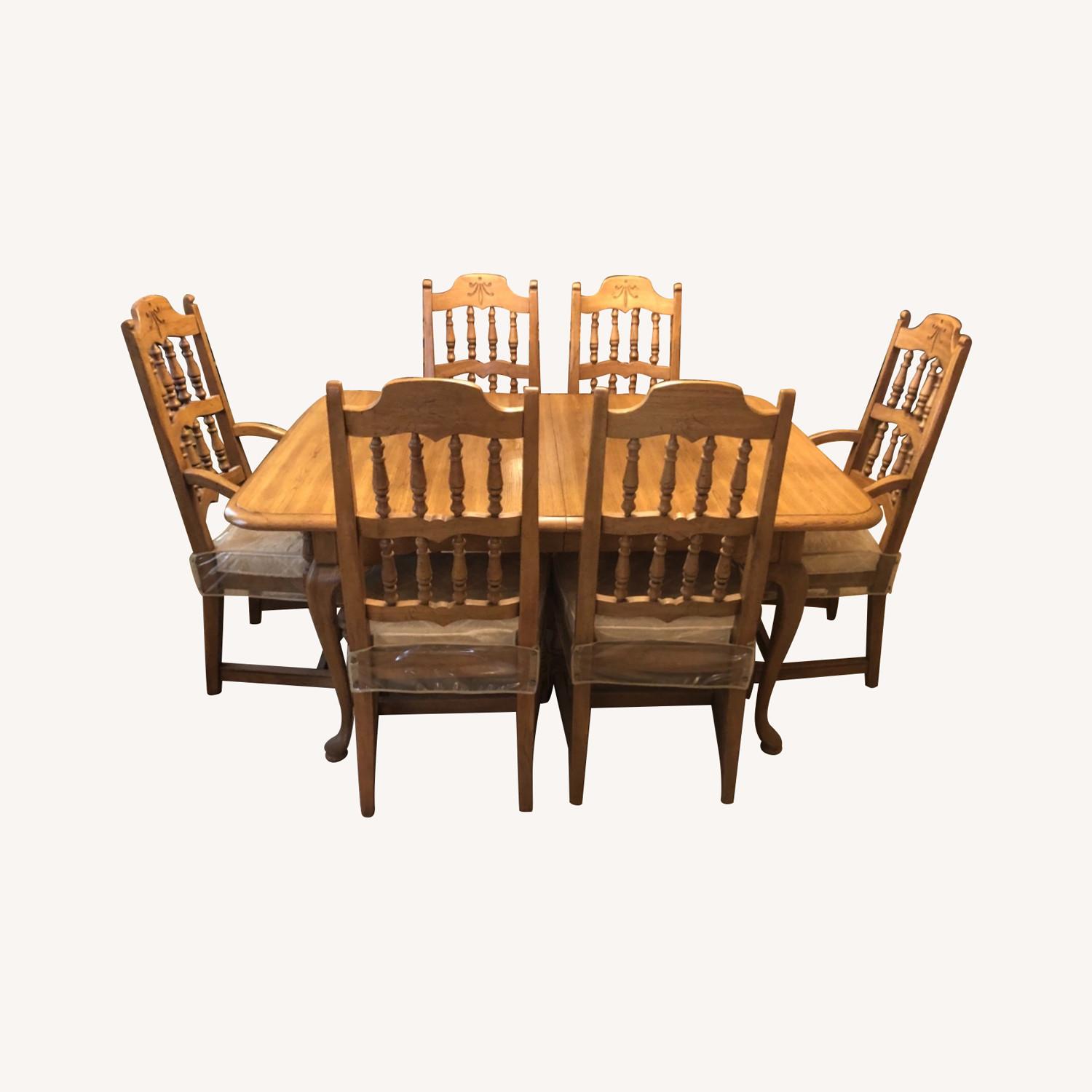Seller's Notes:High quality solid oak dining set. 2 armchairs, 4 regular chairs ( chairs have removable plastic cover), 2 leafs (15” etch), table pads. Excellent condition. Chairs: 46” X 21” X 20”