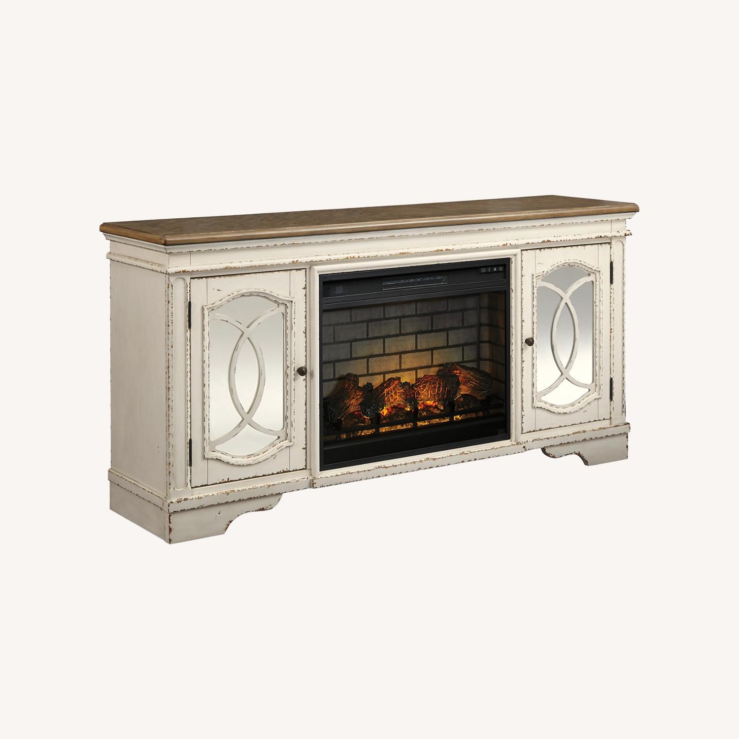 Elevating the art of traditional cottage styling, the Realyn TV stand with fireplace insert is beautifully in tune with your taste. Its antiqued two-tone aesthetic blends a chipped white with a distressed wood-tone top for added charm. The cabinet doors, with decorative fretwork over mirrored glass, add a lovely twist. And what really turns up the heat: an electric infrared fireplace insert with faux firebrick surround that operates with or without infrared heat. With the touch of a button, adjust the temperature and the flame brightness, and set the timer for long-lasting enjoyment. Includes XL TV stand and electric fireplace insert (W100-121) Made of wood, engineered wood and veneers Antiqued two-tone finish Removable center shelf Pair of cabinet doors with inset mirrored glass and decorative fretwork; each cabinet includes single-shelf storage Dark bronze-tone finished metal hardware Cutouts for wire management and ventilation Electric fireplace insert provides up to 5,386 BTU/1,500W and warms up to 1,000 square feet (heats larger rooms) 7-level temperature setting; 5 levels of flame brightness; overheating control device; remote control with LED display LED-lit multi flame display operates with or without infrared heat; realistic-looking log set with dynamic glowing embers Timer function with programmable ranges from 10 minutes to 9 hours Power cord included; UL Listed