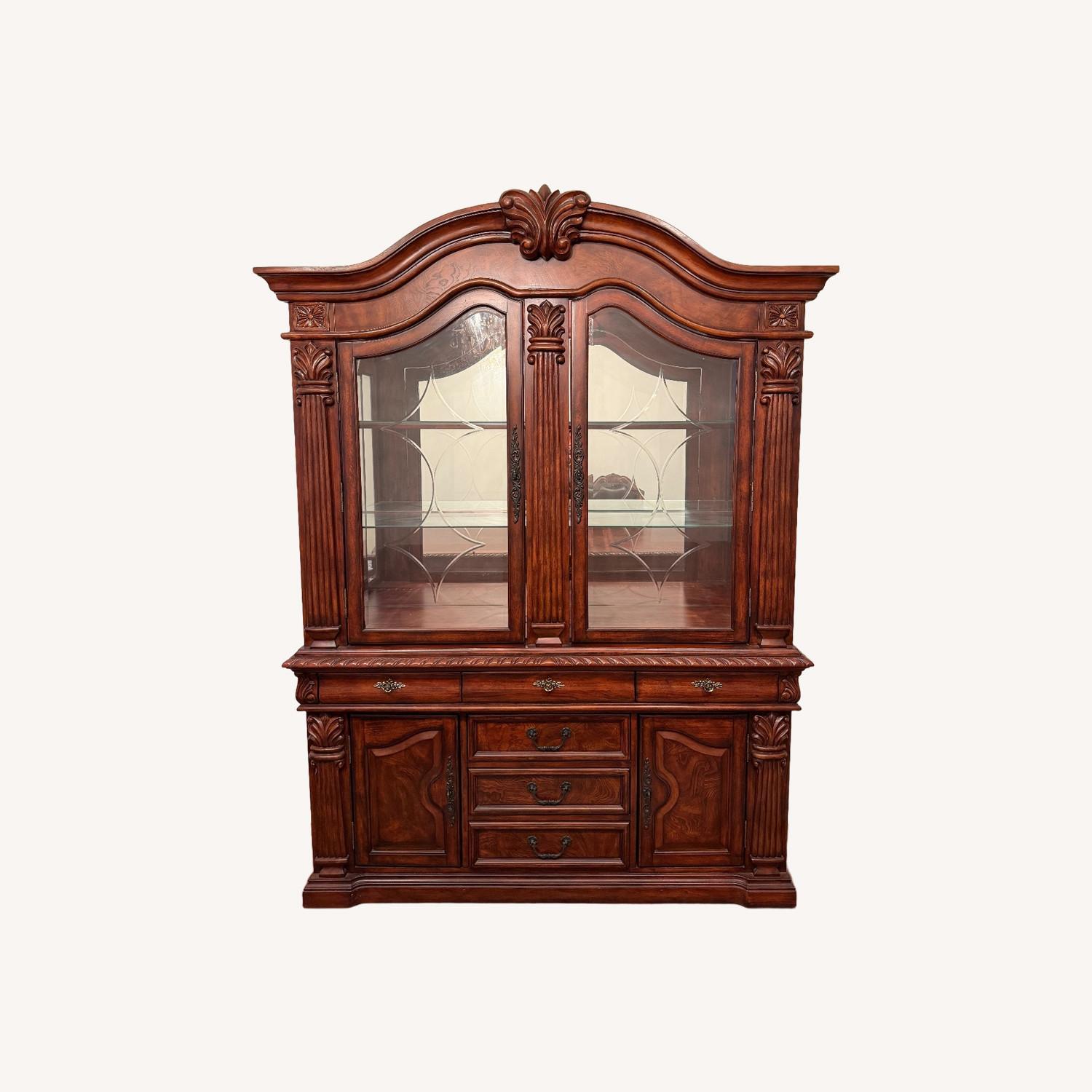 Seller's Notes: Beautiful solid wood china cabinet for sale. Classic carved details with glass display doors. • Width: 64” • Height: 87” • Depth: approx. 18–20” • Built-in interior lighting with 3 adjustable brightness levels Very clean and sturdy. Great for displaying china, glassware, or collectibles.