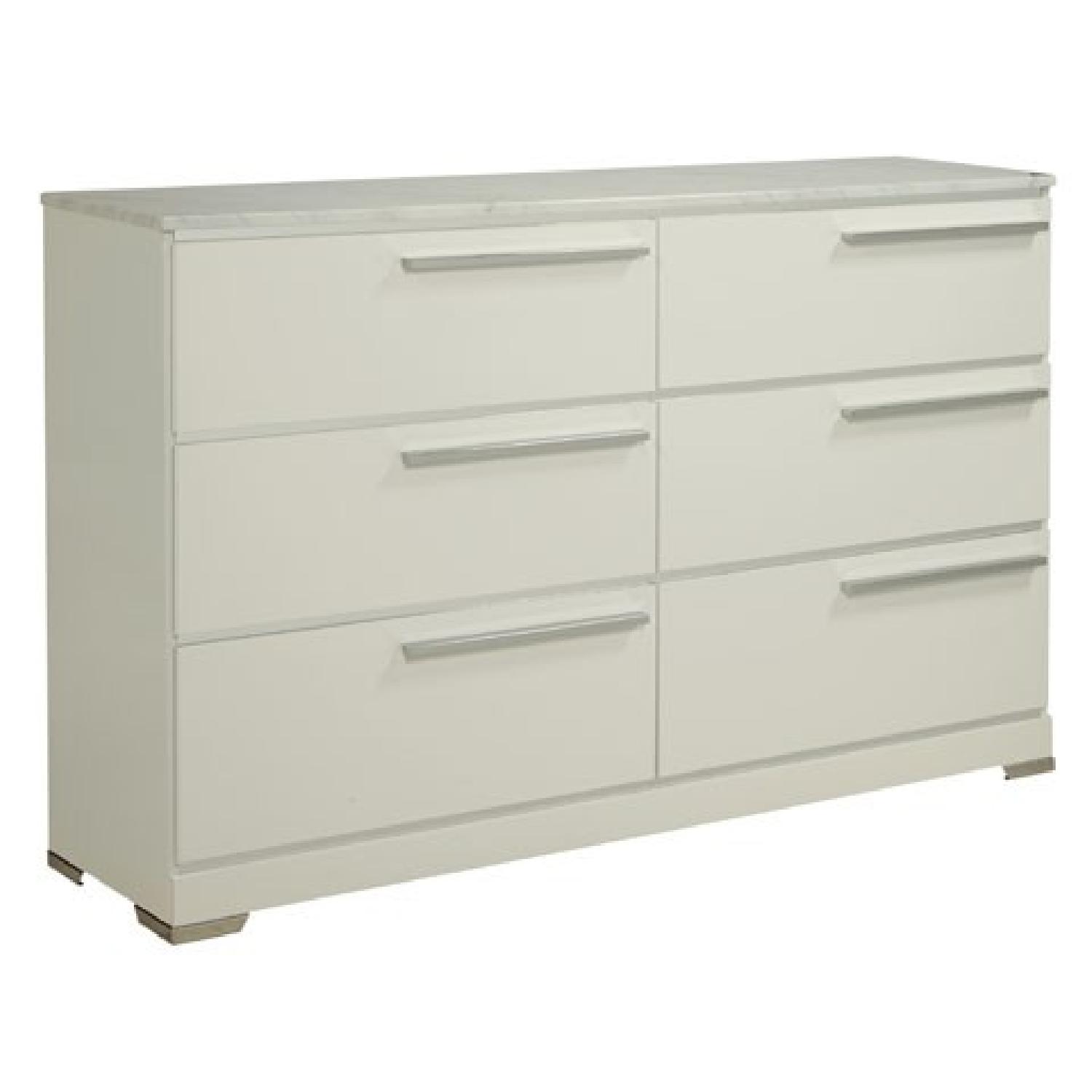 Seller's Notes:This dresser comes brand new in the box. the only assembly required is to put the handles on. Rest easy. The richly contemporary look you’ve been dreaming of is yours for the taking—at a price sure to put you at ease. Brillaney dresser’s clean lines and ultra-white finish exude minimalist-chic style to the max. Sleek chrome-tone metal drawer pulls, asymmetrically placed, are a high-design touch. Faux marble top is truly extraordinary. More Dimensions: Top drawer interior (2) 27.25" x 13.00" x 5.00" Middle and bottom drawer interior (4) 27.25" x 13.00" x 6.50"