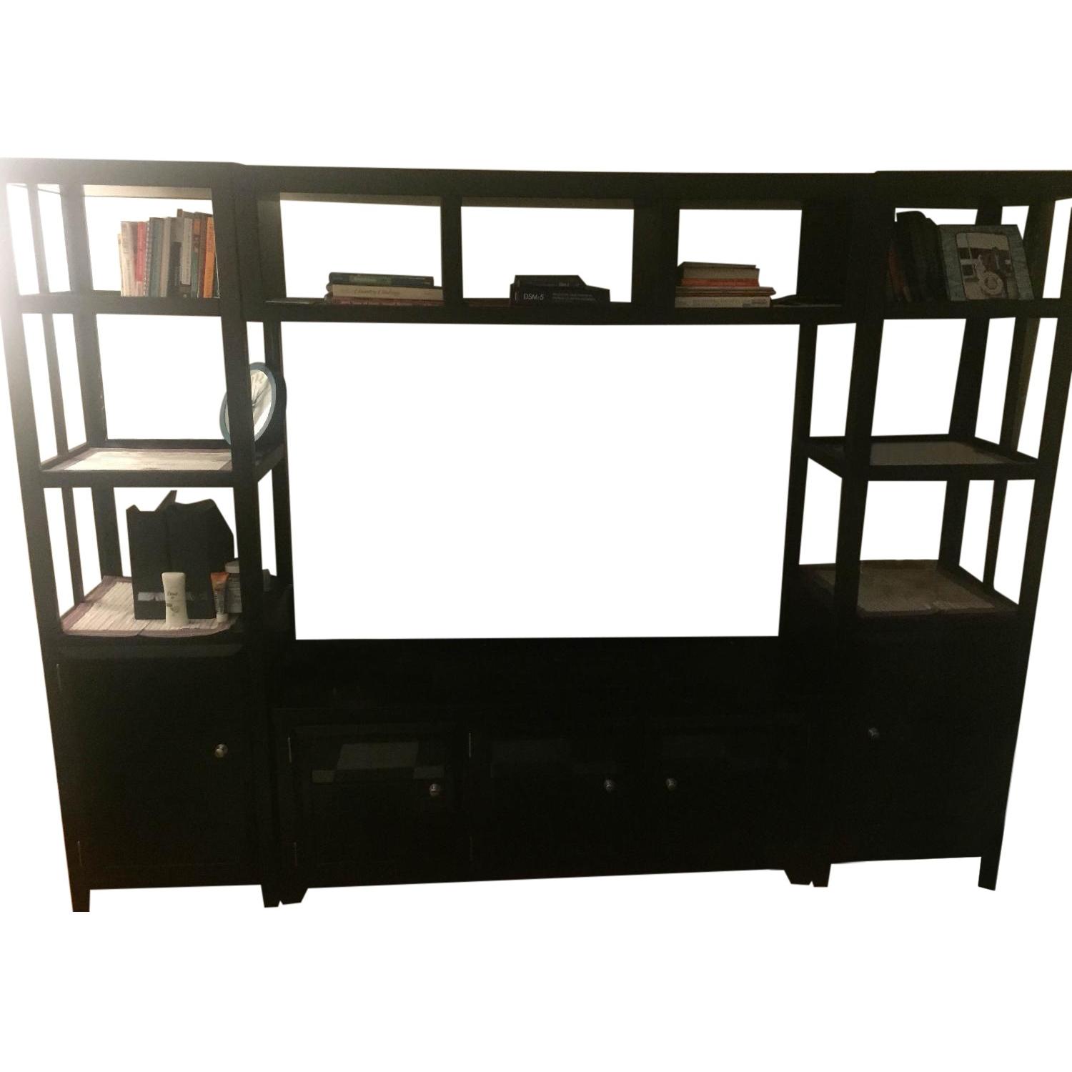 Seller's Notes:The "Naomi" entertainment center features a dark finish in a straight-lined design which comes together perfectly to create a refreshing contemporary style that is sure to be the centerpiece of any living area. The dark almost-black finish flows beautifully over the stylish etagere design and beveled frame details of the door panels flawlessly enhancing the contemporary feel of this entertainment wall. Adorned with bright satin nickel color hardware, the "Naomi" entertainment center is the perfect addition to any home decor. Features: - Dark Brown Finish - Beveled frame door panels. - Adjustable shelves in TV Stand & Cabinets of Piers. - Satin Nickel Colored Hardware - One Year Warranty