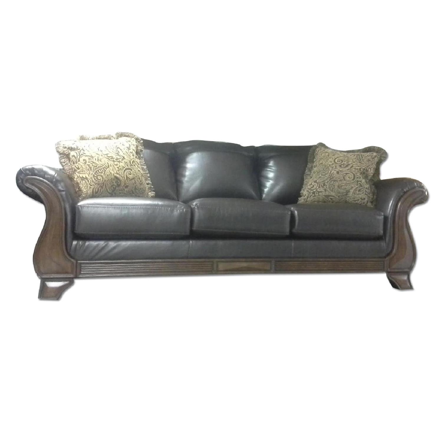 Seller's Notes:this sofa is a brand new floor sample in our store. there aren't any scratches or blemishes to it at all. its in great condition. With the sophisticated style of the sweeping rolled arms and classic beauty of the rich finished and perfectly detailed showood, the traditional style of the “Riverton-Java” upholstery collection is sure to enhance the look and feel of any living room décor. the style is traditional classic.