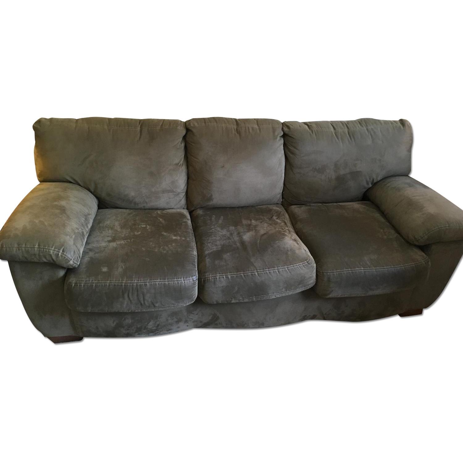 Seller's Notes:I bought this couch new in the mid 2000s from a showroom. The brand is Ashley Furniture and it's pretty rad. Comfy microfiber, relatively light for moving to clean, and all of the cushions still have great support. It has a tiny tiny hole on one seat cushion (the hole is the subject of one of the close up photos). It has a tear on the top behind one of the back cushions (also pictured). That tear is hidden by the top of the back cushion, so I never bothered sewing it, but I imagine you could sew it shut pretty easily.