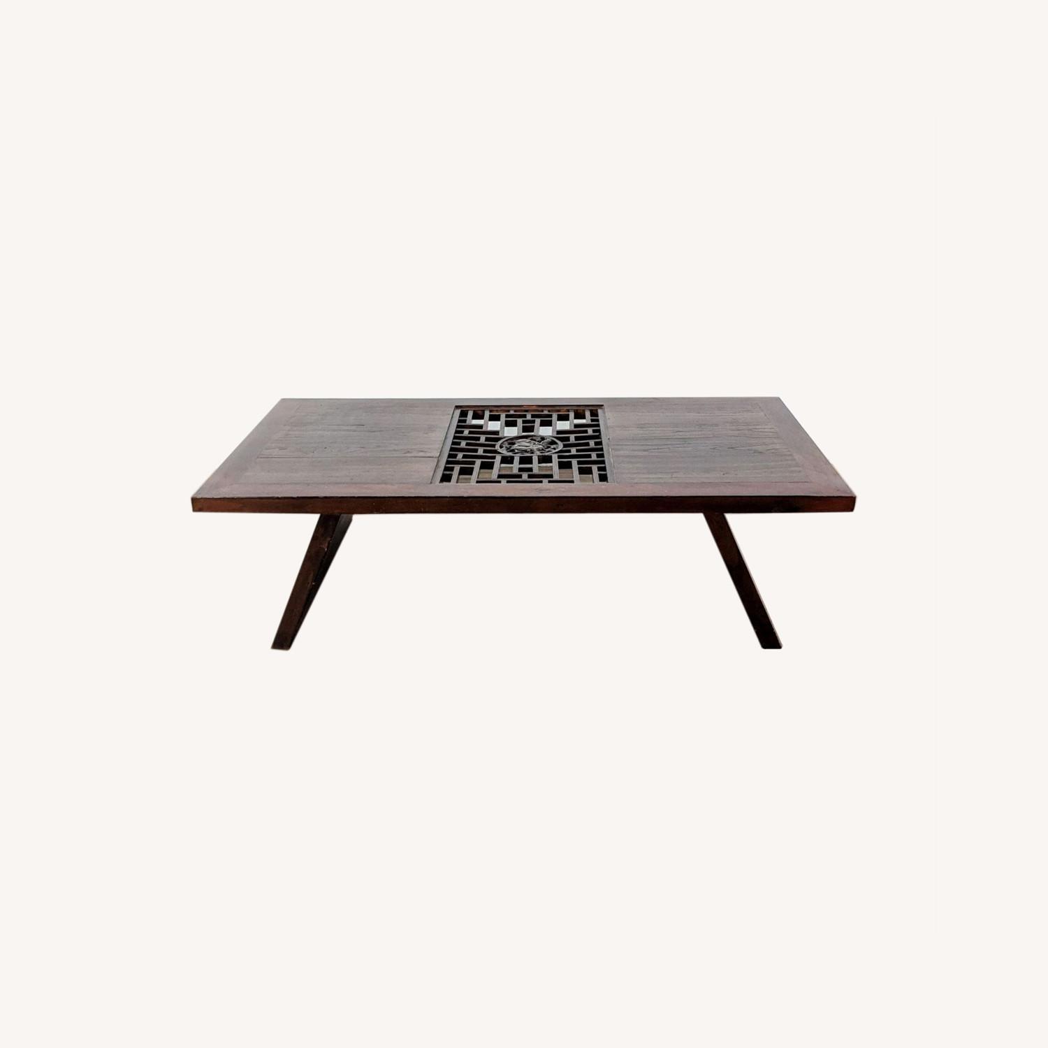 Seller's Notes:Wood table with Chinese fretwork screen insert featuring center medallion. Brand: . Model: . #SKU: 1042343