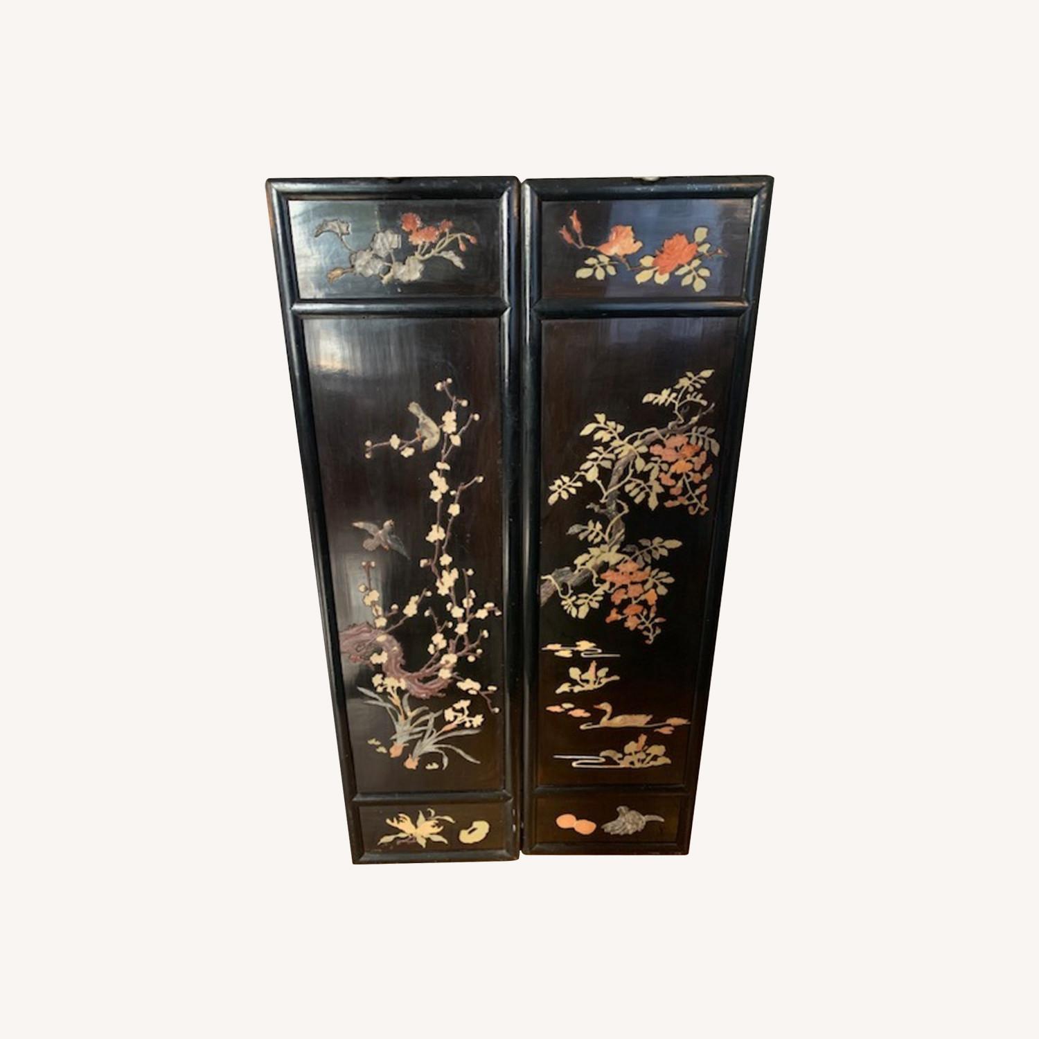 Seller's Notes:The wall hangings are high gloss black with stone inlays of birds and flowers. Each hanging is separate and can be displayed separately or adjacent to each other. I bought these wall hangings in 1999 at the bankruptcy sale of the Concord Hotel in the Catskills. In the 1950's, 60's and 70's it was one of the top resort hotels in the Catskills, and entertainers such as Tony Bennett, Judy Garland and Barbra Streisand performed there.