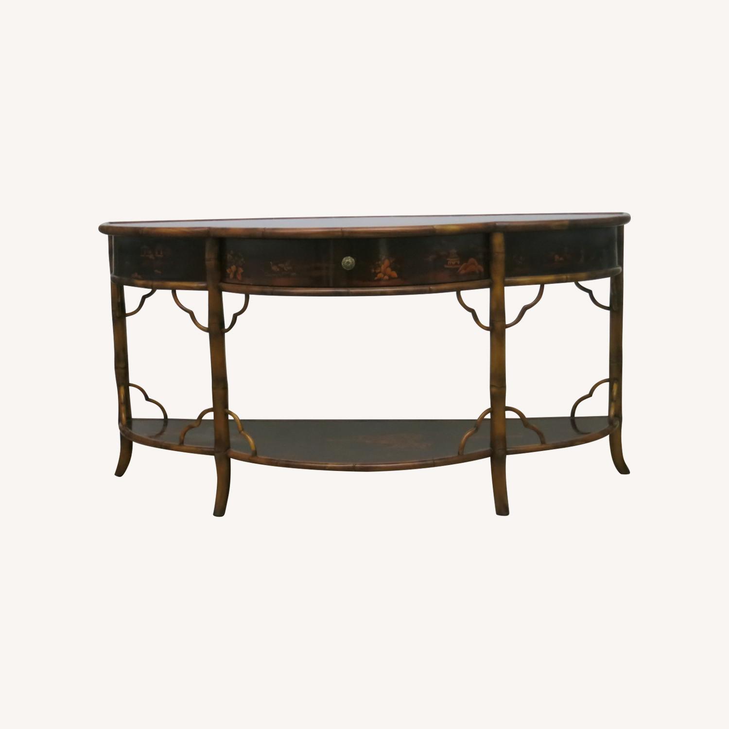 Seller's Notes:The item was purchased from the French furniture company Grange. There is a bottom shelf and a large drawer below the top surface It was used for a brief period of time and is in perfect condition. The burgundy color and amber detail as well as the bamboo trim provide a dramatic focal point for a dining room or foyer area.