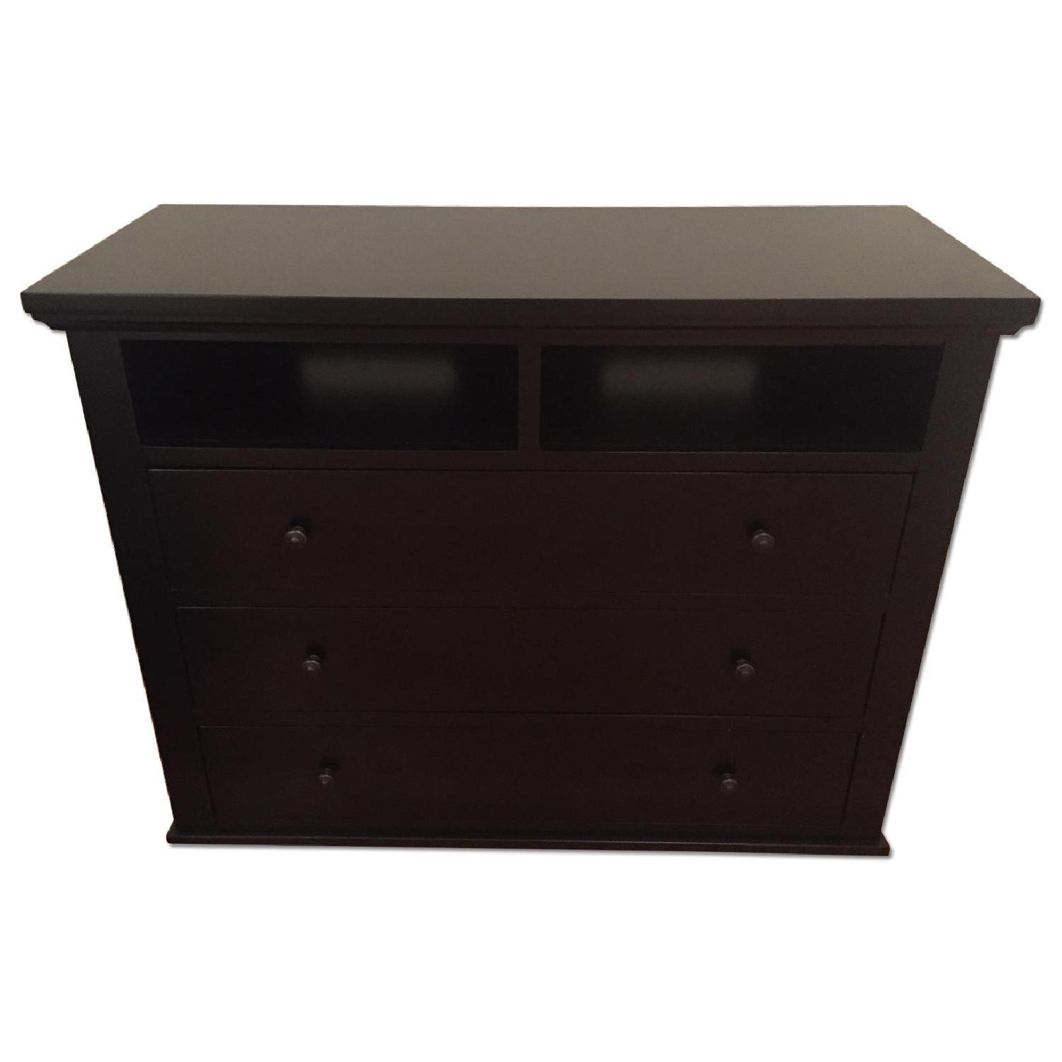 Seller's Notes:Black chest with three full-extension drawers and two open-component areas (each opening 18"w x 5"h x 15"d) Excellent condition (one area on top where black paint is slightly more matte - barely noticeable) Option to attach "feet" Was originally $700