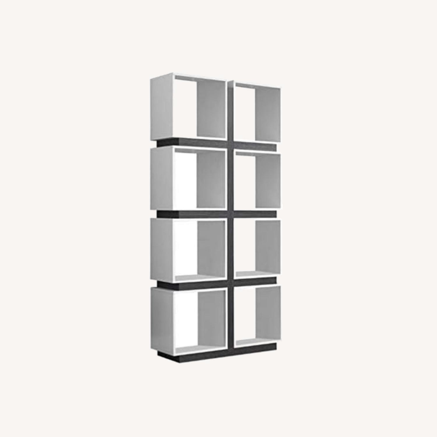 Seller's Notes:Brand: Atlin Designs Give your home a modern art-deco look with this 8 cubic shelf bookcase. This perfectly symmetrical bookcase has 8 cubic spaces to showcase all your collectibles. With an open back, this piece can also be used as a room seperator. Featuring a Gray cedar finish and white shelves, this unit will be the focal point of any room. Features: Finish: white and gray Includes 8 cubic storage shelves Specifications: Overall Dimensions: 71" H x 34" W x 12" D Weight:102lbs