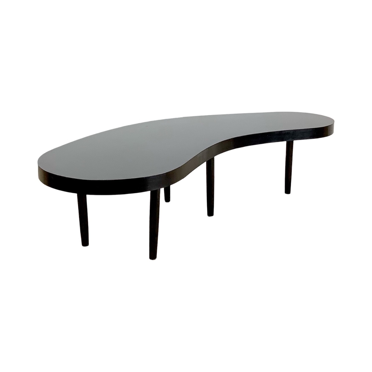 Seller's Notes:This vintage Atomic Modern coffee table combines sculptural form with material restraint, resulting in a piece that feels expressive yet composed. The kidney-shaped top immediately evokes the organic modernism that defined the Atomic era. Finished in black laminate, the surface is clean and consistent, allowing light and shadow to emphasize the table’s curves throughout the day. The finish also offers durability for everyday living. The table is built over heavy wood construction, giving it a solid, grounded feel that enhances its presence in a room. This substantial build distinguishes it from lighter contemporary interpretations. Rounded edges and a thick profile reinforce the table’s sculptural identity, making it visually engaging from every angle. Supporting legs are placed with restraint, ensuring stability without interrupting the flow of the design. A classic vintage Atomic Modern piece that functions equally well as furniture and statement design. Dimensions: 67w 25d 17h Condition: appropriate wear, vintage finish worn, scuffs/scratches, discoloration, dings/chips, edge wear, see photos.