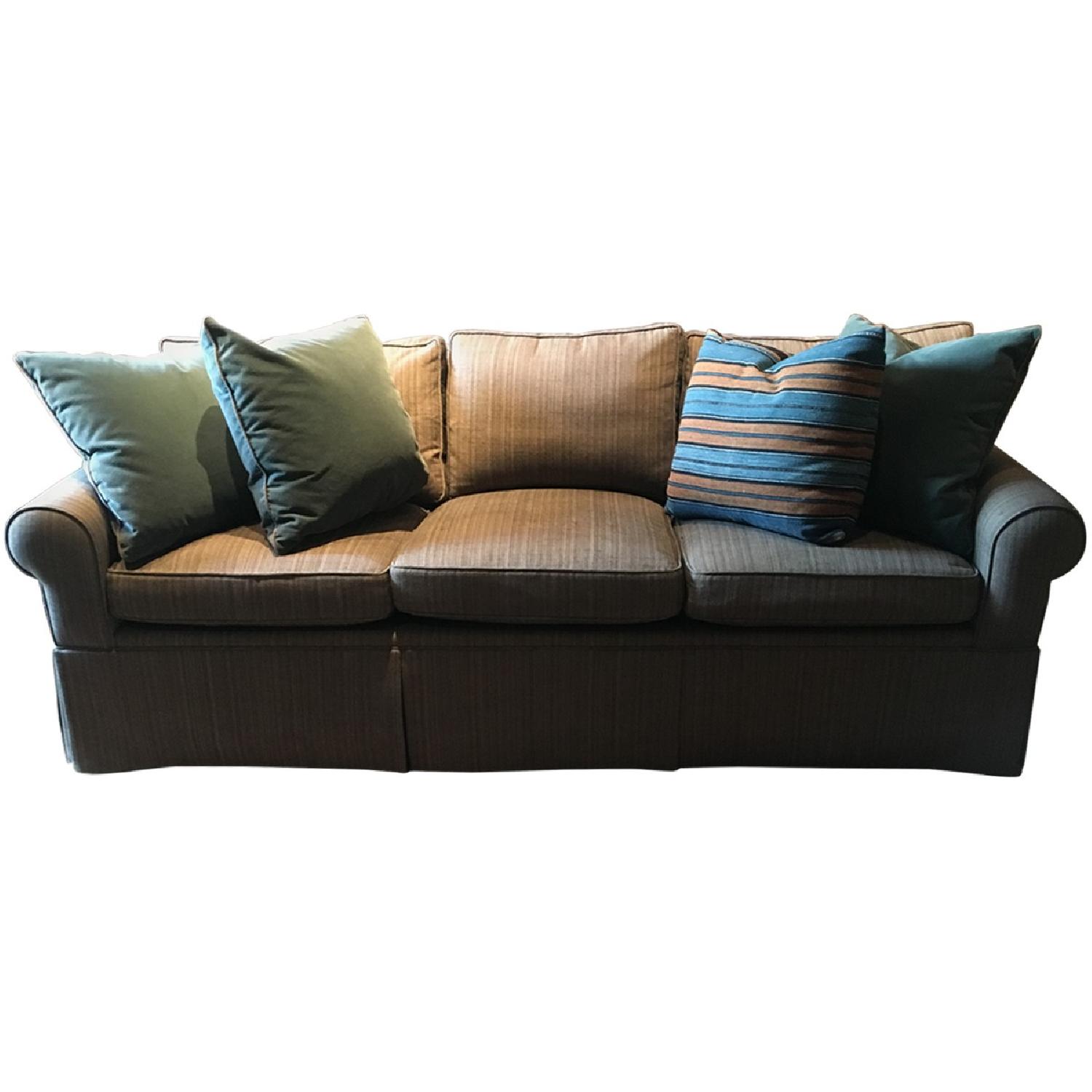 Seller's Notes:Since 1968, Avery Boardman has been crafting bespoke sofas, sleeper sofas, and upholstered pieces that are as stylish as they are comfortable. This traditional three-seat sleeper sofa is upholstered in smooth beige cotton fabric and makes for additional sleeping space when guests stay over. WIDTH 82" DEPTH 38" HEIGHT 32" ARM HEIGHT 24" SEAT HEIGHT 20" Sleeper sofa: Width 60", Depth 72", Height 23" Accent pillows: Width 20", Depth 20" - Style 101 three-seater sofa extends into a sofa bed - Upholstered in a brown poly blend with four accent pillows in a ribbed velvet with tweed piping - Rounded arms and pleated skirt - Down- and feather-wrapped foam pillow fill