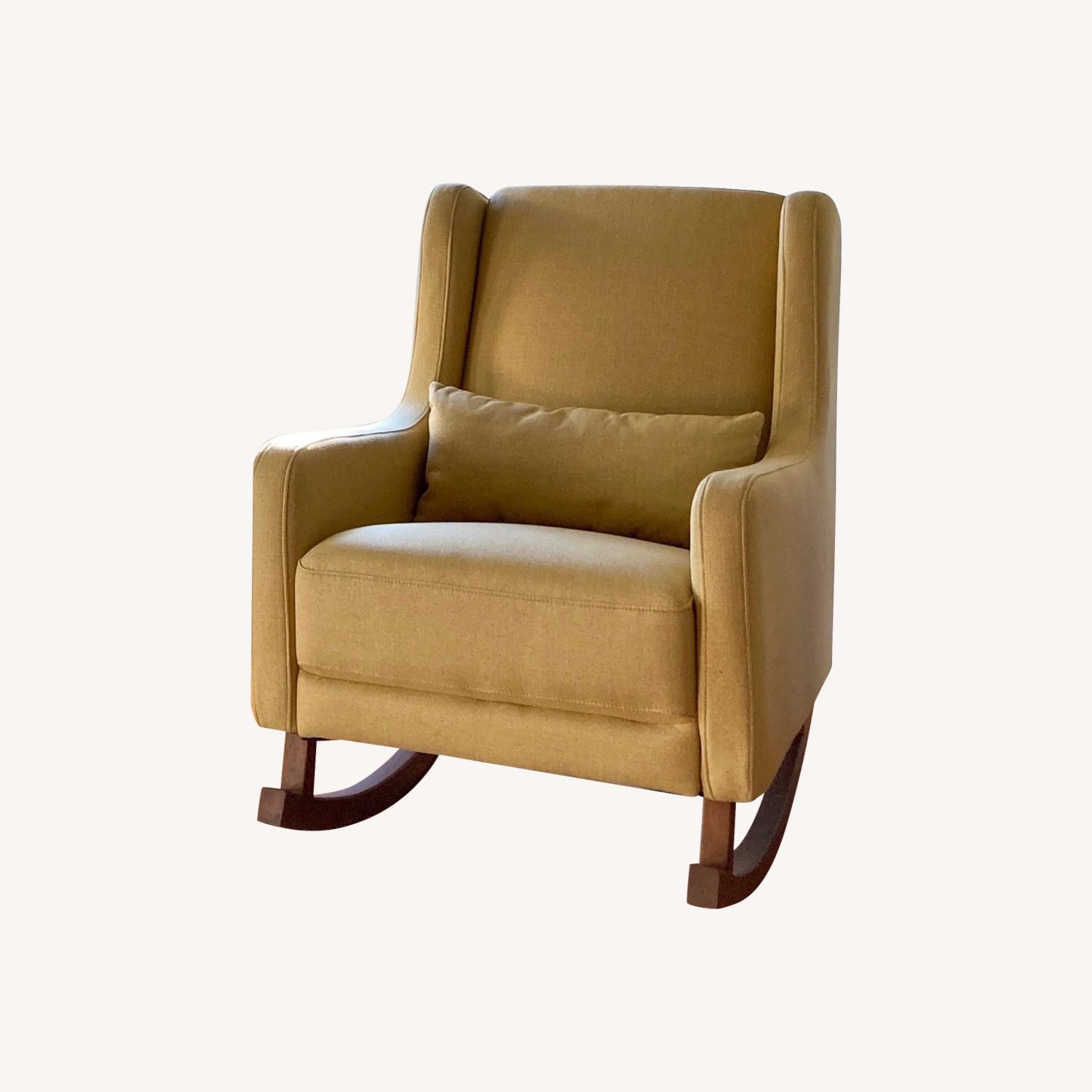 MODERN WINGBACK STYLE: A modern twist on a mid-century wingback rocking chair with softly rounded edges and curved walnut-stained legs. The Dijon shade will add a vibrant pop of color to your room while still working well with earthy, natural tones.