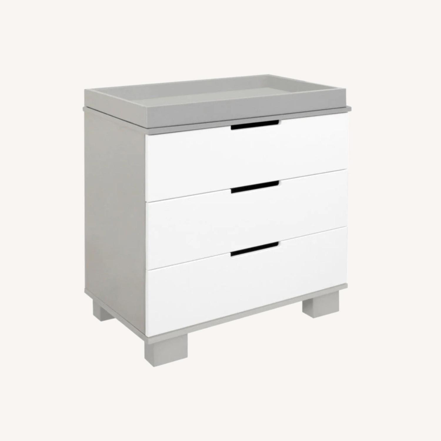 A changing table on top and a dresser just below, the modern Modo 3 Drawer Changer Dresser is a space-saving nursery necessity. Smart and stylish, the sleek design of the Modo 3 Drawer Changer Dresser provides ample drawer storage space. Up top, the changing tray's raised sides help keep baby safe. Once baby has grown out of using the changer it can be removed to leave a chic dresser. The drawers smoothly and gently slide open thanks to metal glide hardware. Stop mechanisms on the drawers keep baby safe by ensuring drawers can't be pulled all the way out. The changer dresser also includes an anti-tip kit to further enhance safety by attaching the dresser to the wall. The Modo 3 Drawer Changer Dresser matches the modern Harlow, Modo and Mercer convertible cribs, and the portable Origami Mini Crib.