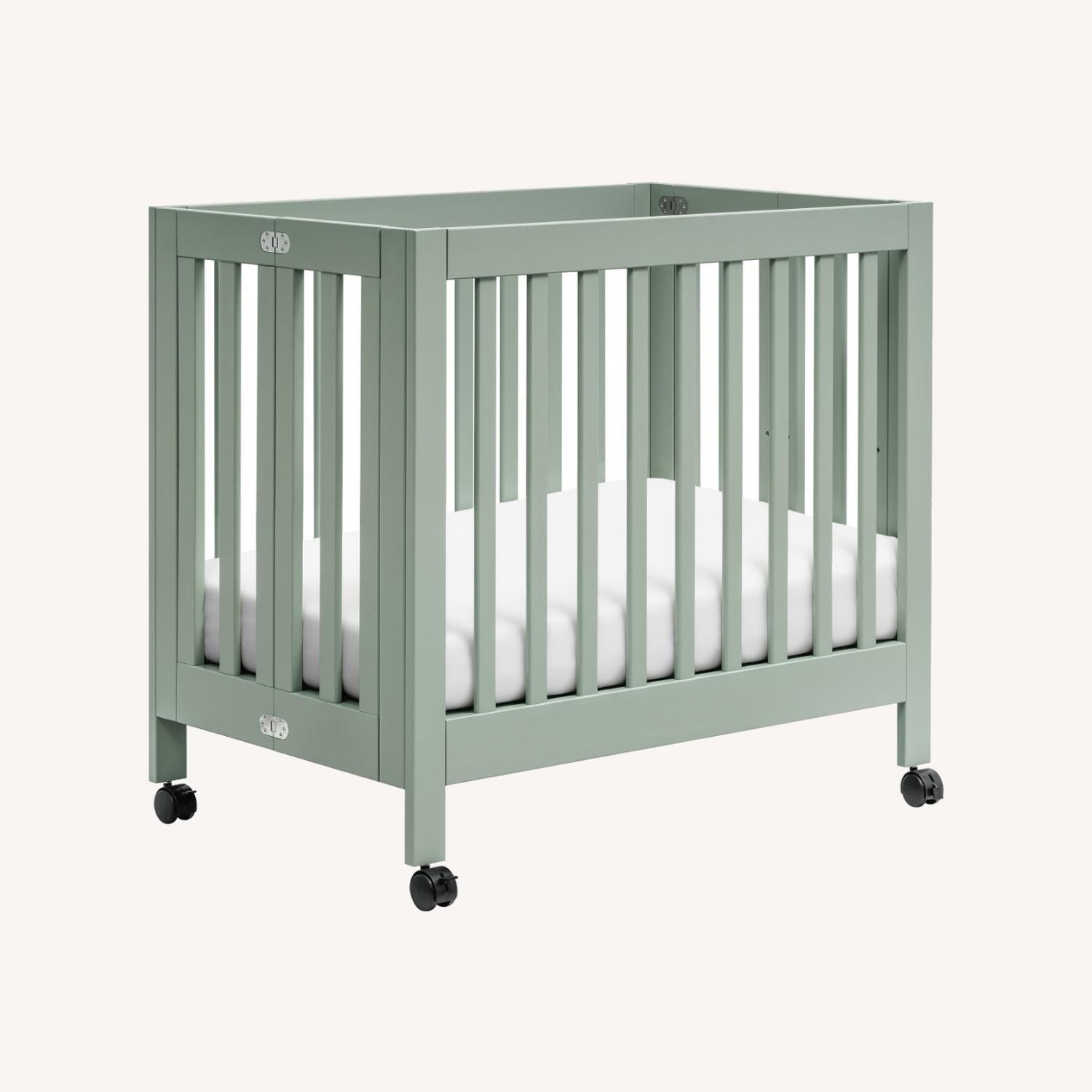 Seller's Notes:Perfect for urban living or secondary living spaces, this Origami Mini has a petite footprint and rolling feet, allowing for easy movement through the home. Offered in a gender-neutral blue-green Lagoon shade, the sustainable wood crib even folds flat for effortless storage. Despite its small size, our baby slept comfortably in the crib until age two (and could have stayed longer!). It's super durable and light, with only a few scuffed areas as far as wear and tear. We're also happy to discuss including a Naturepedic mattress, cover and Brooklinen sheets as part of the sale.