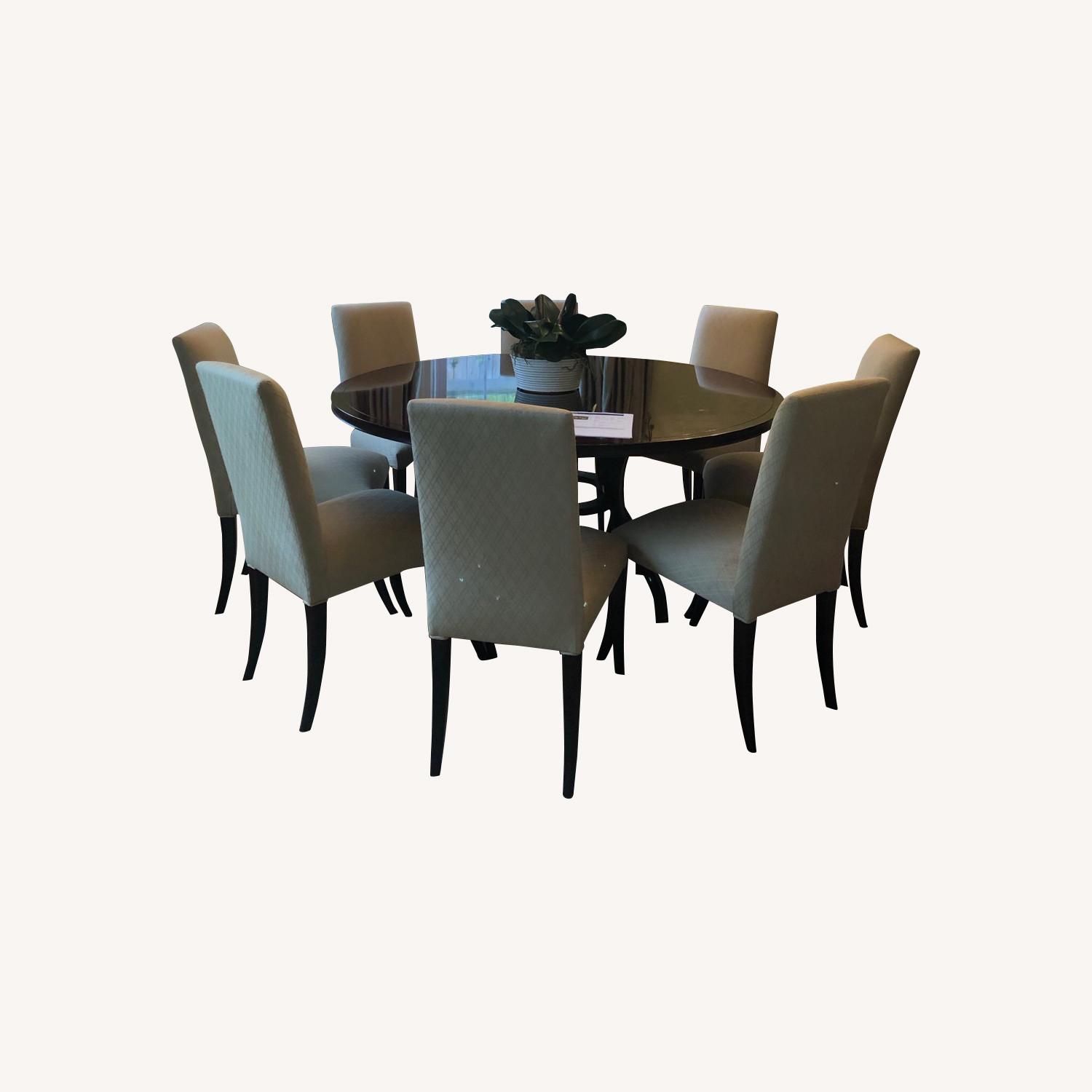 Seller's Notes:Barbara Barry Baker Furniture neoclassical round pedestal dining table with eight chairs. Designed by Barbara Barry for Baker, this pedestal table has a 60 inch round top with concave rim. Six curving legs are connected by a circular stretcher. The luxurious mahogany wood is covered in a rich, dark finish. I fell in love with Barbara Barry collections at the Baker Furniture. Although we have had it for years, it was rarely used as it was in our formal dining room. It was more of an accent piece. This mahogany table is in good condition with some imperfections and surface markings. Good condition overall.