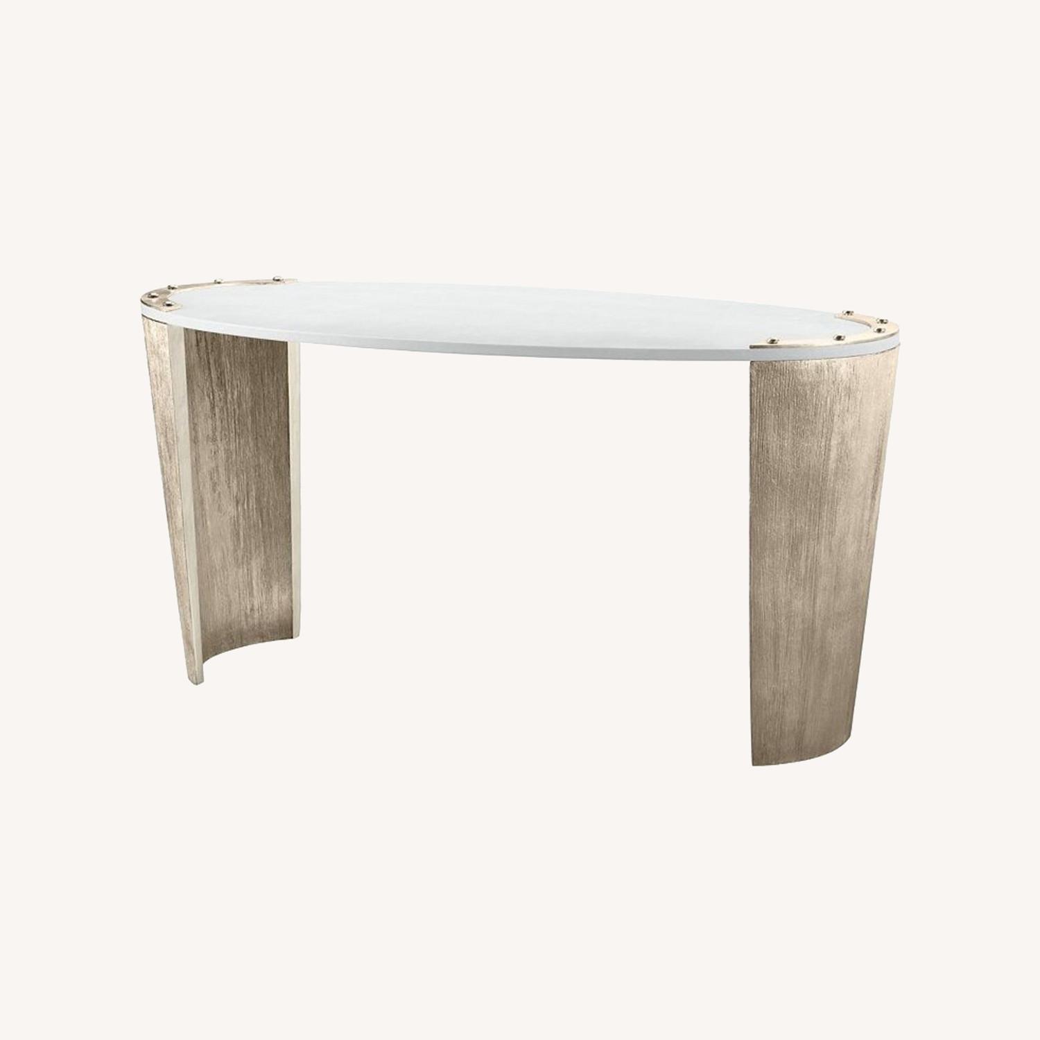Seller's Notes:Selling a stylish wooden oval desk with a cream wood top and white gold wood legs from Baker Furniture. It would look great in a home office. *slight wear and tear as the desk is about 7 years old