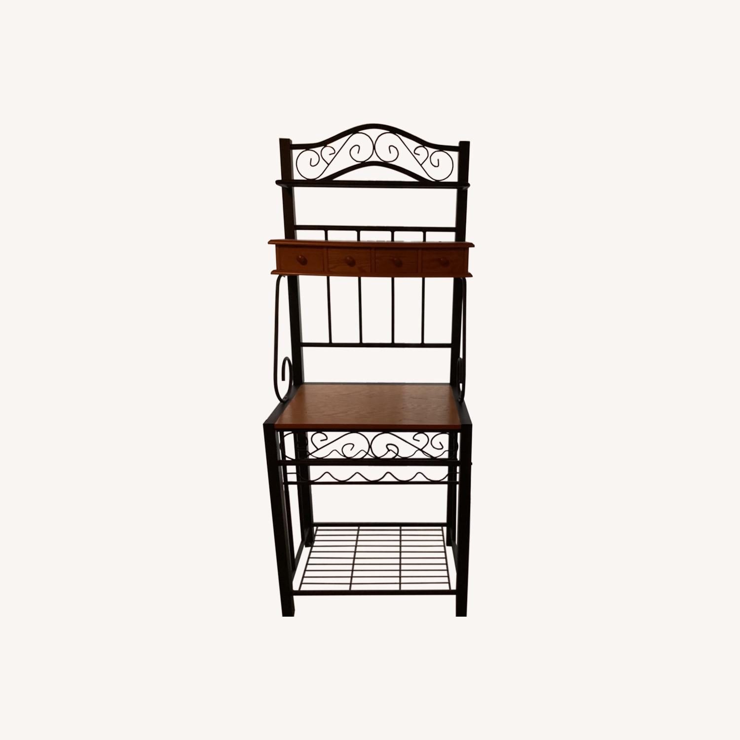 Seller's Notes:Perfect size Baker’s Rack in dark green metal with wood counter, 4 small wood drawers and holds 4 bottles of your choice of beverages, with bottom rack for your baskets or magazines. Can be used in a kitchen, dining room, entryway of you choice!
