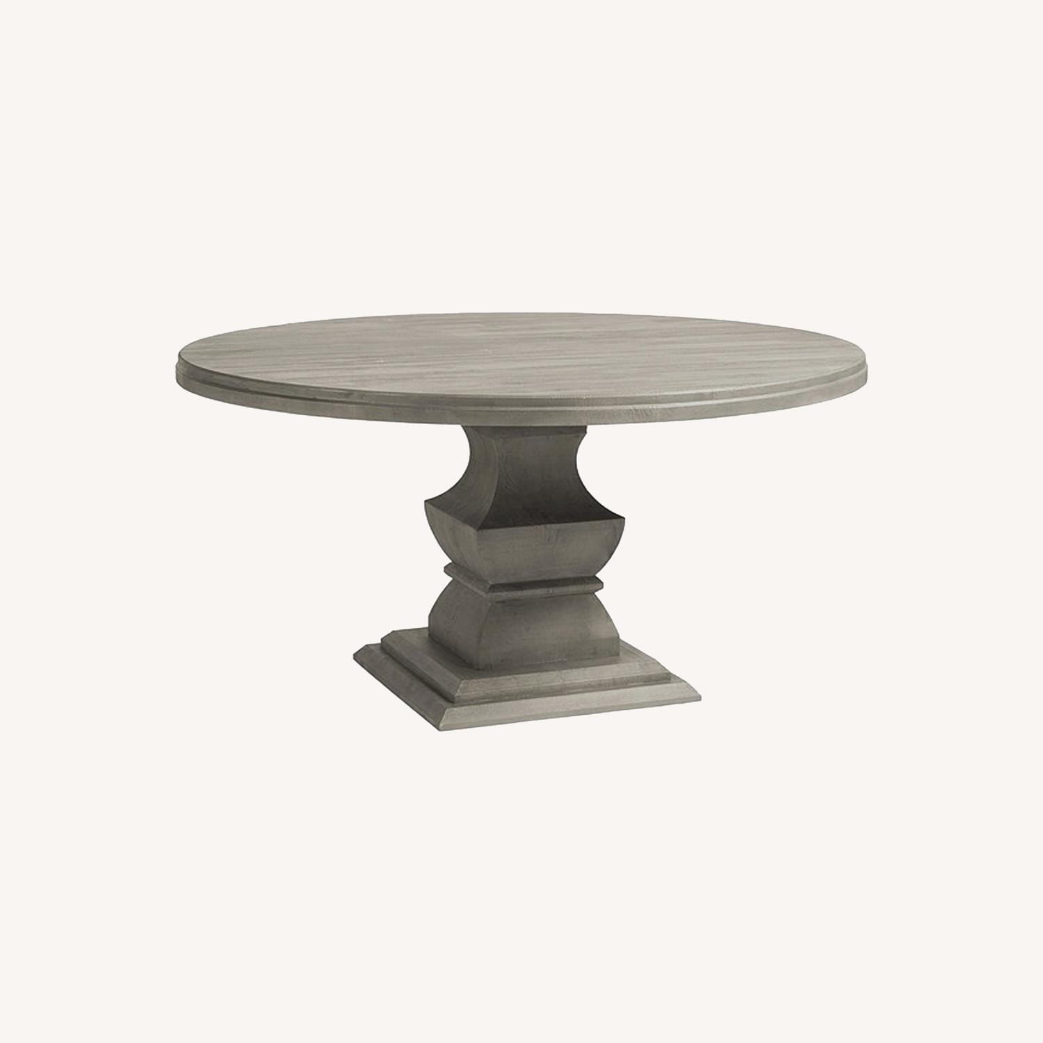 Seller's Notes:GRAYWASH FINISH NO LONGER AVAILABLE FROM BALLARD! The 60" Andrews Graywash pedestal table has been triple sealed with a water-based poly stain in a satin finish, which makes it very resistant to spills. There are no water rings due to the sealing. Can seat 6 comfortably, and can fit 8 people if needed. This table has some small markings from use, but they are not very visible. If you want more detailed photos, please send a message. There is some texture to this table, so the imperfections blend in. However, the finish is not 100% perfect (tiny dents or flecks visible if you look closely). Very durable and family-friendly.