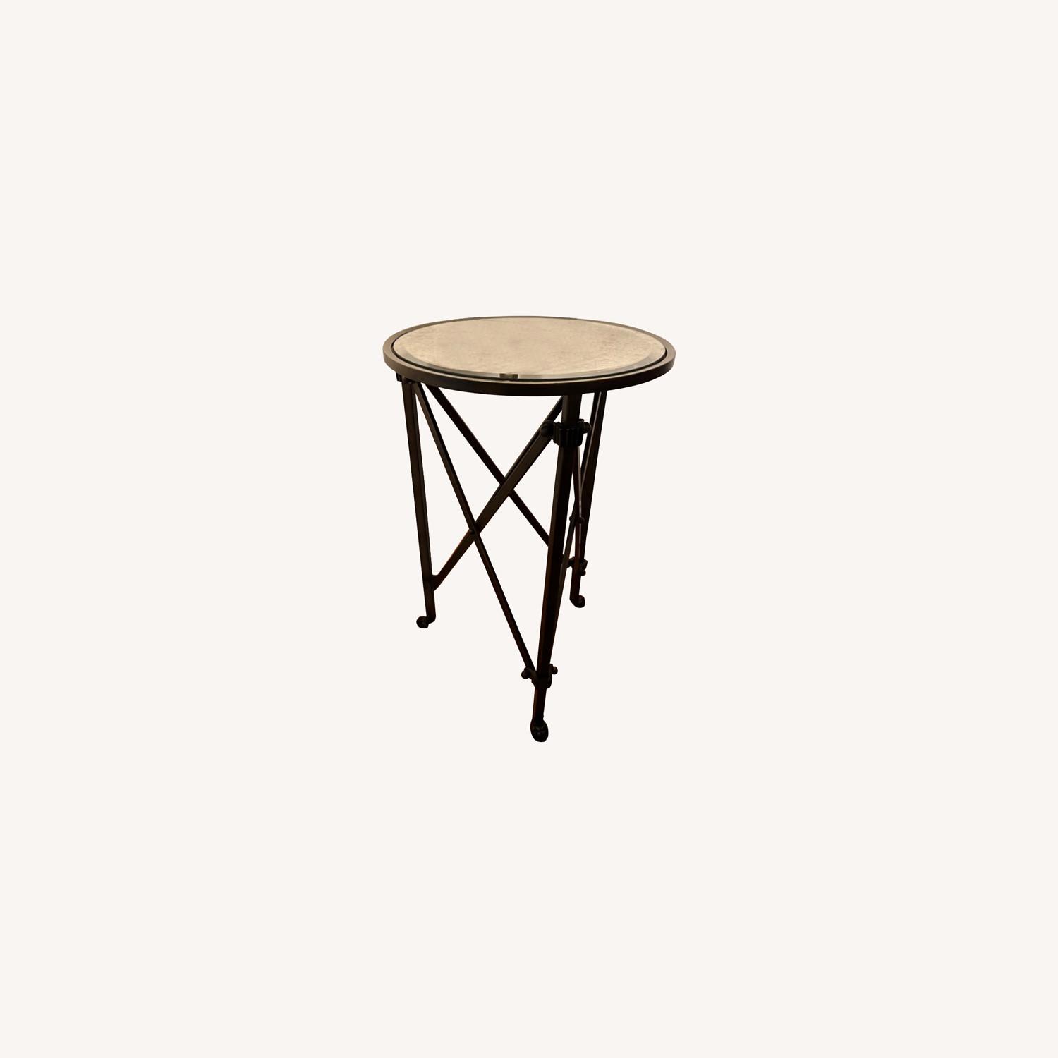Seller's Notes:2 tables are available! A stylish update on the classic French gueridon, this mirrored side table is just the right size for parking a drink beside your favorite chair. Its beveled mirror top is supported by three metal legs strengthened with "X" stretchers. the website shows a plan glass mirror, mine is smoked glass as seen in photos Olivia Mirrored Side Table features: Classic claw-footed legs "X" stretchers for support Ribbed collar details Fully assembled Dimensions: Overall: 26 1/2"H X 17" Diameter Construction: Made of iron frame with mirror top.