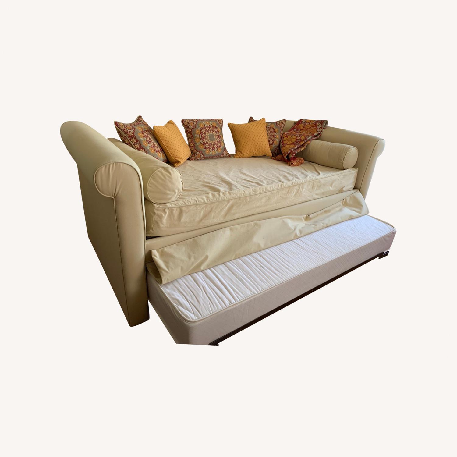 Seller's Notes:This is a sturdy design, comfortable couch and provides two twin size beds. It's barely been used. It sat in our office for 2-3 years and then was in storage. The fabric color is Adena Pure Sunbrella (a pale apple green). When I look closely there are a few areas where the fabric has faded that are barely visible. We purchased it for $2349 with the trundle and cover. Comes with two twin mattresses.