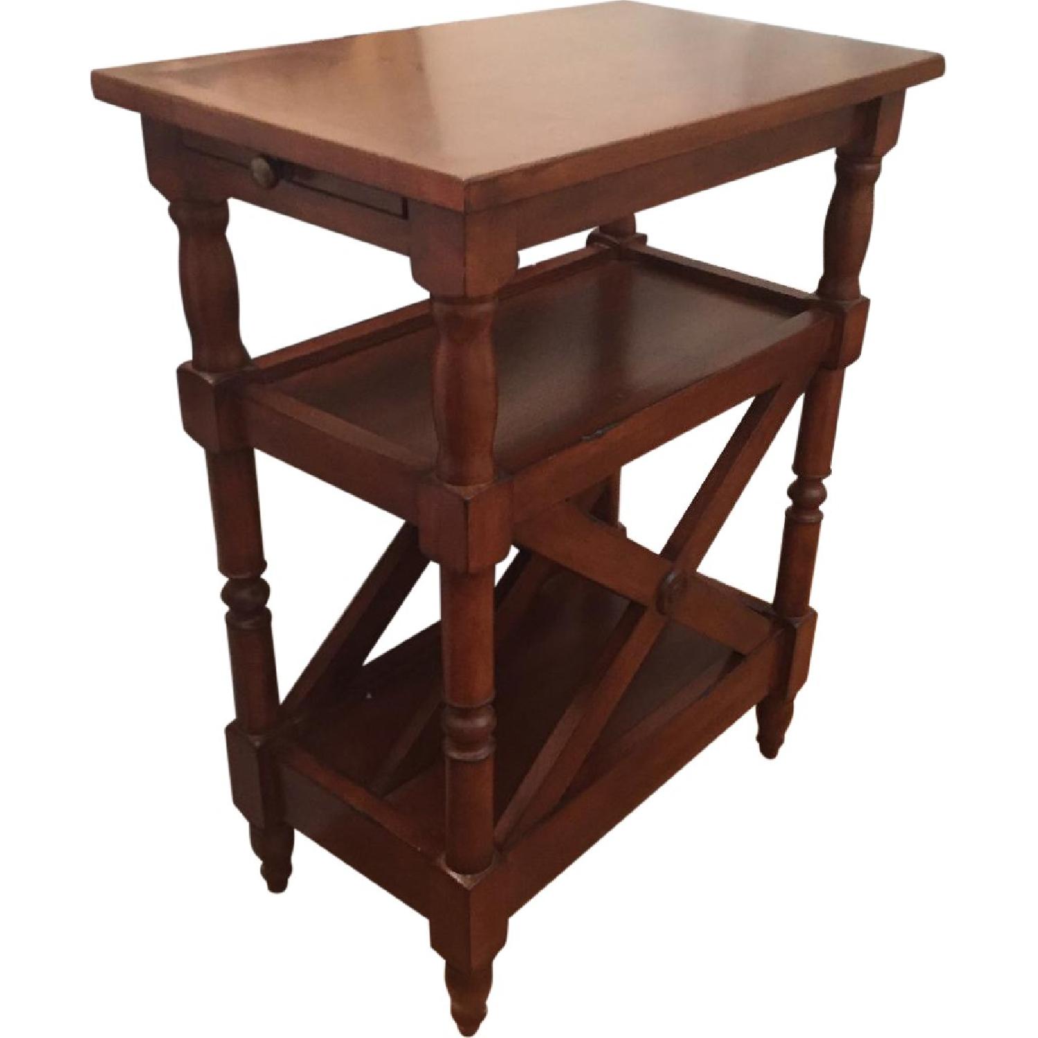 Seller's Notes:End tables that offer versatile storage in a space-saving size are tough to find. With its narrow profile, our Annette side table is an easy, comfortable fit beside your favorite reading chair. "X" supports create two spaces for magazines, with a shelf above for extra storage. Annette Magazine Side Table features: Small pullout shelf hidden beneath the top holds a drink Crafted of birch & birch veneers Carved medallion details