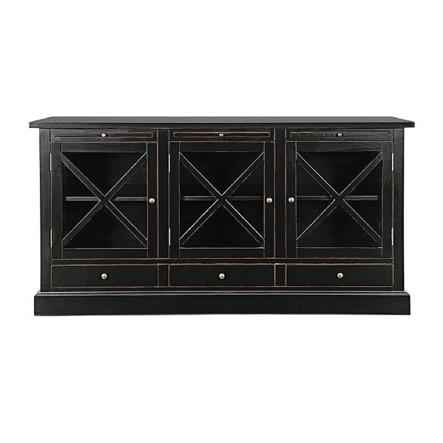 Seller's Notes:Its crisp lines and striking "X" details give this versatile console a solid, finely crafted look. Three slide-out shelves beneath the top nearly double your serving area in the dining room or your workspace in the office if used as a credenza. Three glass-front sections have one removable shelf each with one drawer each beneath for lots of storage options.