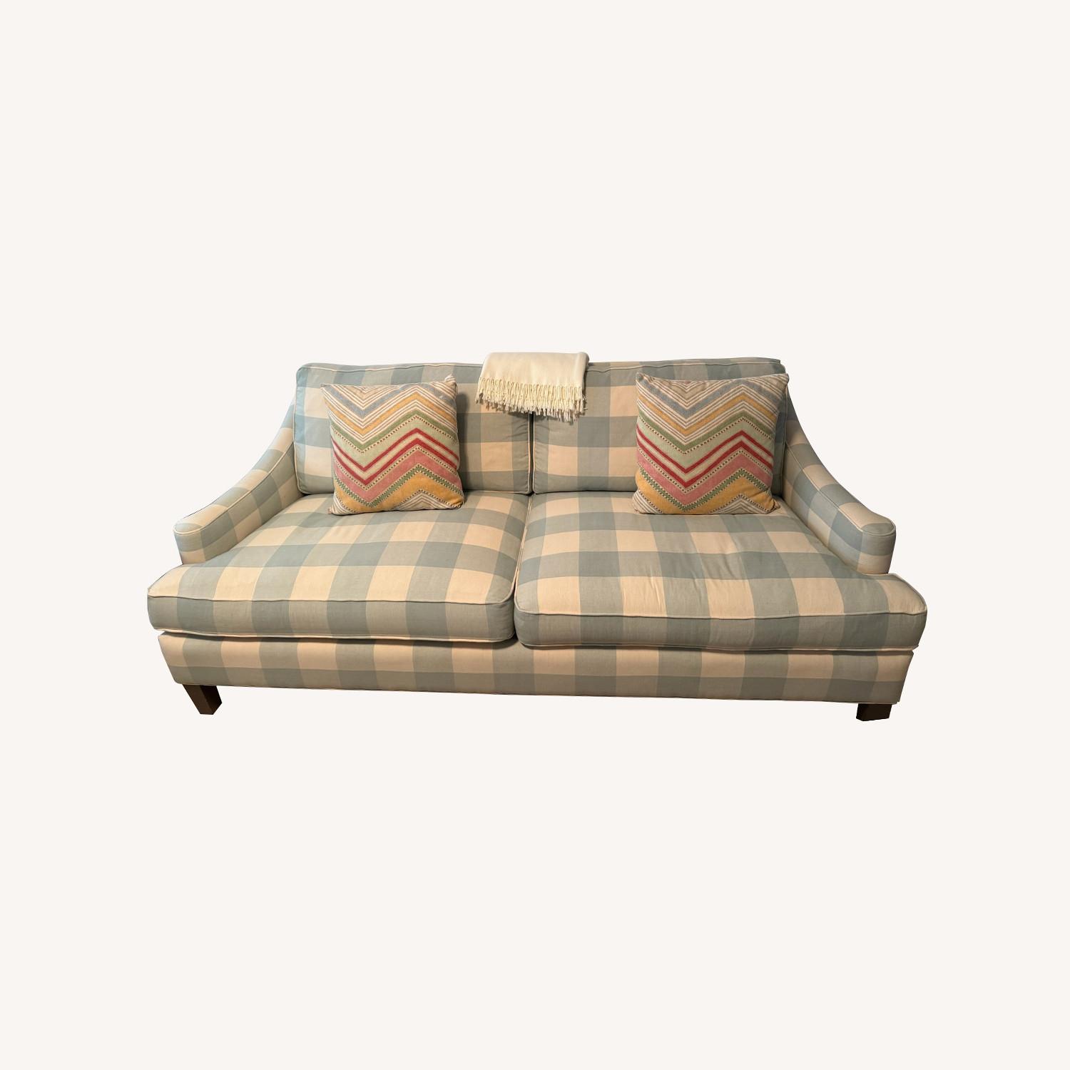 Seller's Notes:Excellent condition from a smoke free and pet free home. Blue and white Ballard checked sofa with a tiny imperfection as seen in photo.