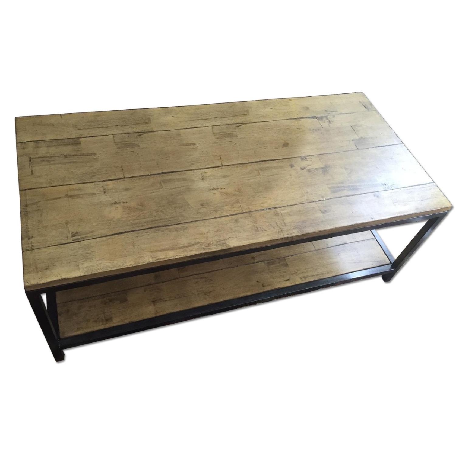 Seller's Notes:Selling a very gently used, 1 year-old coffee table from the Durham collection at Ballard Designs. Has served a smoke-free, pet-free Brooklyn home. Inspired by a vintage bricklayer's table, the clean architectural lines of this metal frame coffee table work well in any home with a warm, rustic aesthetic. The generous lower shelf offers plenty of room for books, games, and other display items. Planked wood top is heavily distressed and finished with a rustic gray wash to bring out their natural grain and character. Routered planked tops. Aged steel metal finish. Dimensions: Overall: 18 1/4"H X 50"W X 24"D Between Shelves: 12 3/4"H Construction: Constructed of parawood, engineered hardwood and veneers with a metal frame.