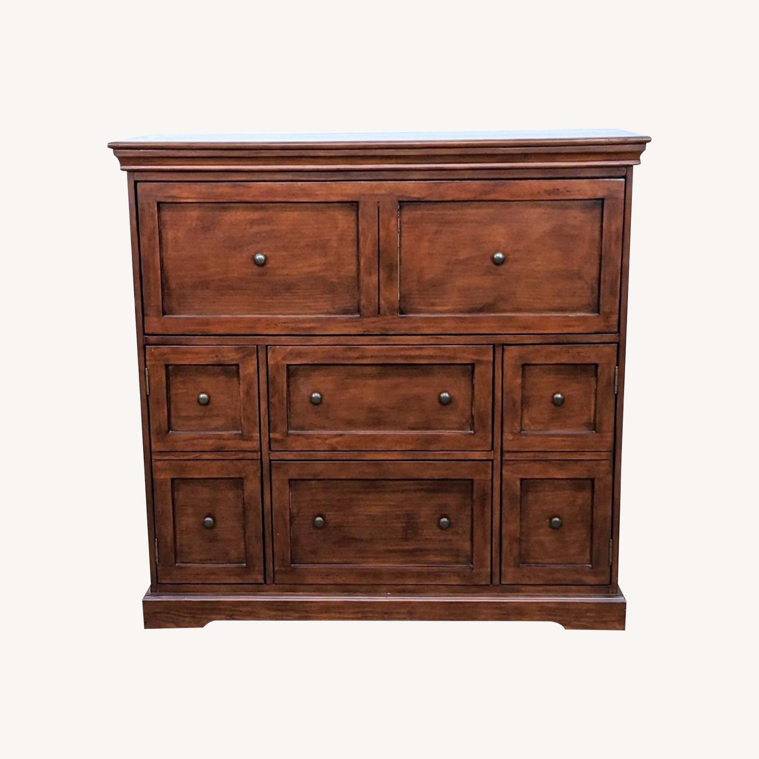 Seller's Notes:Description: The Eastman Secretary Desk from Ballard Designs features a top compartment that opens on safety-glide hinges to reveal a spacious workspace and slide-out printer tray, two cabinets with a shelf, two drawers for files, a cord management system, power strip with 3 plugs and 2 usb ports and levelers for perfect alignment. Constructed from hardwood and veneers.. Brand: Ballard Designs. Retail price: $1999. Gently used - any blemishes or damage will be included in the photos. #SKU: 1058260. Tags: veneer,wood,contemporary,transitional