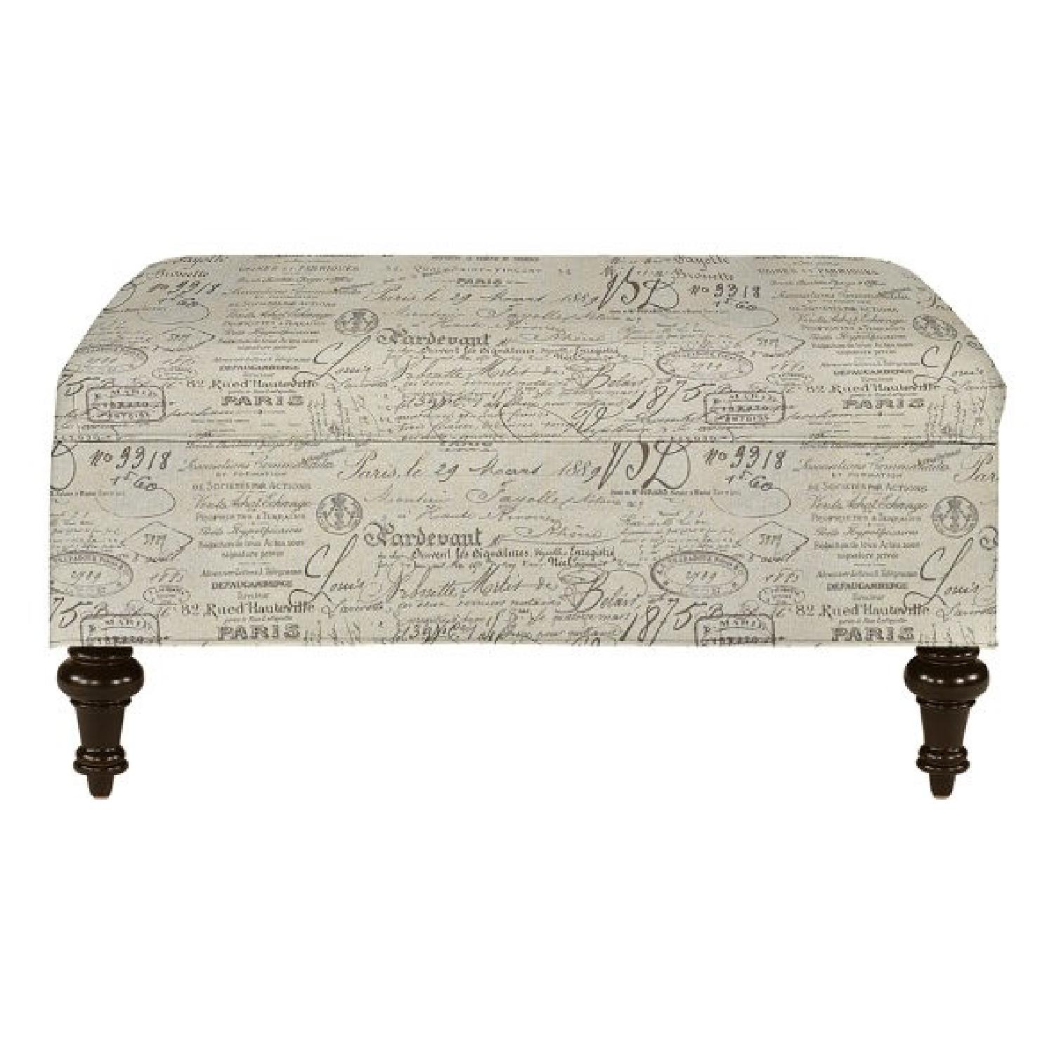 Seller's Notes:This piece is large enough to serve as a casual coffee table. Designed with turned maple legs, the fabric design is french writing. It is in good condition. Small stain but not noticeable.