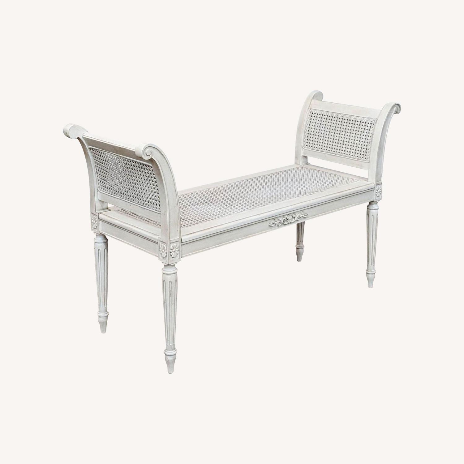 Seller's Notes:Description: White Patina Cane Seat Bench With Side Arms, Cabriolet Legs And Carved Wood Detailing. Brand: Ballard Designs. Seat heigt: 18. Retail price: $800. Gently used - any blemishes or damage will be included in the photos. #SKU: 1058511. Tags: shabby chic,wood