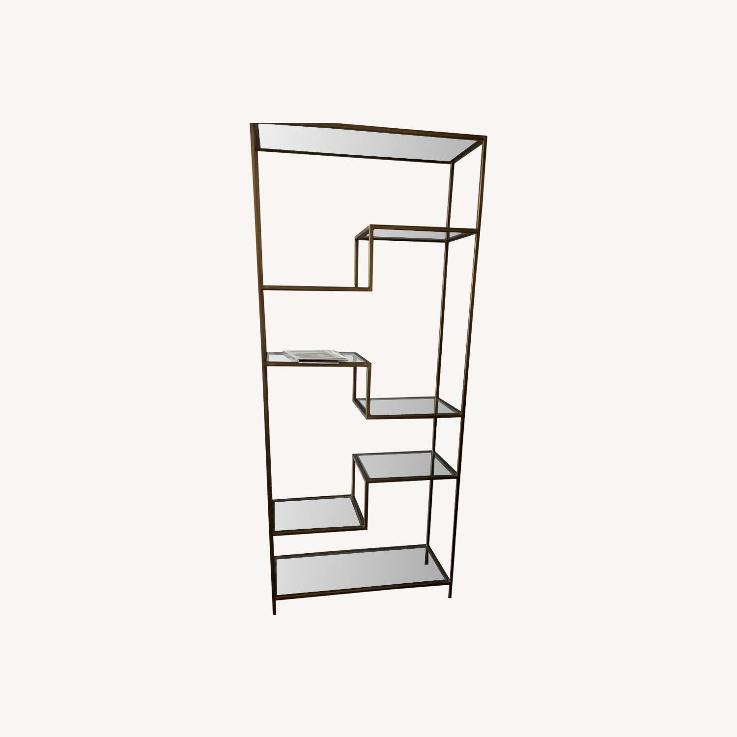 Seller's Notes:Lorna Étagère blends airy elegance with Chinoiserie allure. The sleek geometric frame has six glass shelves that create staggered floating stages for art, books and decorative accents. Top and bottom are also fitted with glass for maximum storage and display. Moving, does not fit in new space.