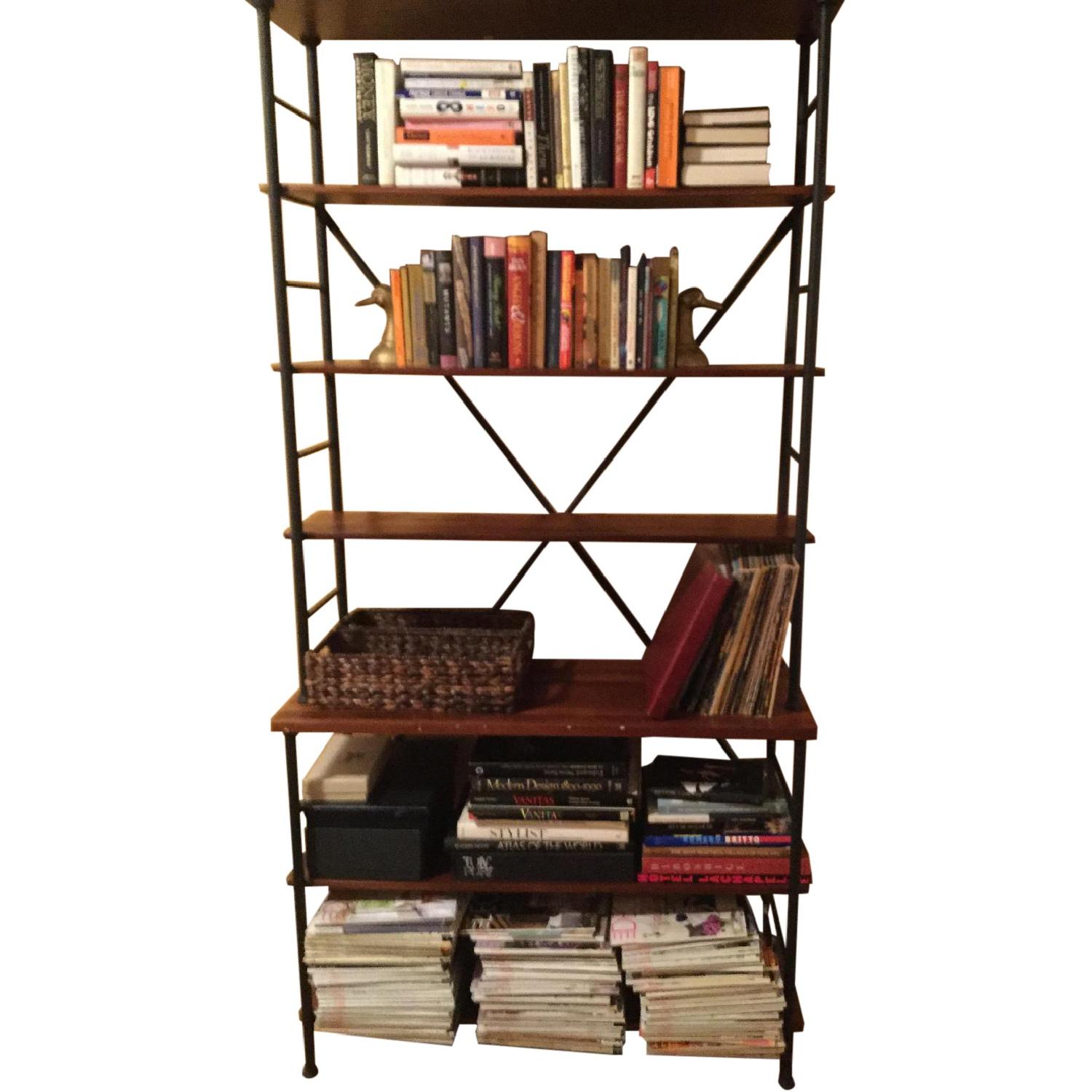 Seller's Notes:We enjoyed this set of bookcases in the bedroom to hold books, magazines, a TV, and nick knacks. Its lofty height and stepped, open design offers generous display area without overwhelming your room. Tubular metal frame is finished in matte black with crossed back supports. Seven shelves are crafted of Southwestern birch and finished in distressed English cherry. Bottom, center and top shelf are fixed; remaining four adjust easily on side rails. Slight separation in the wood on one of the shelves, photo provided, and priced accordingly for an otherwise showroom quality set of bookcases. http://www.ballarddesigns.com/sonoma-bookcase/162797