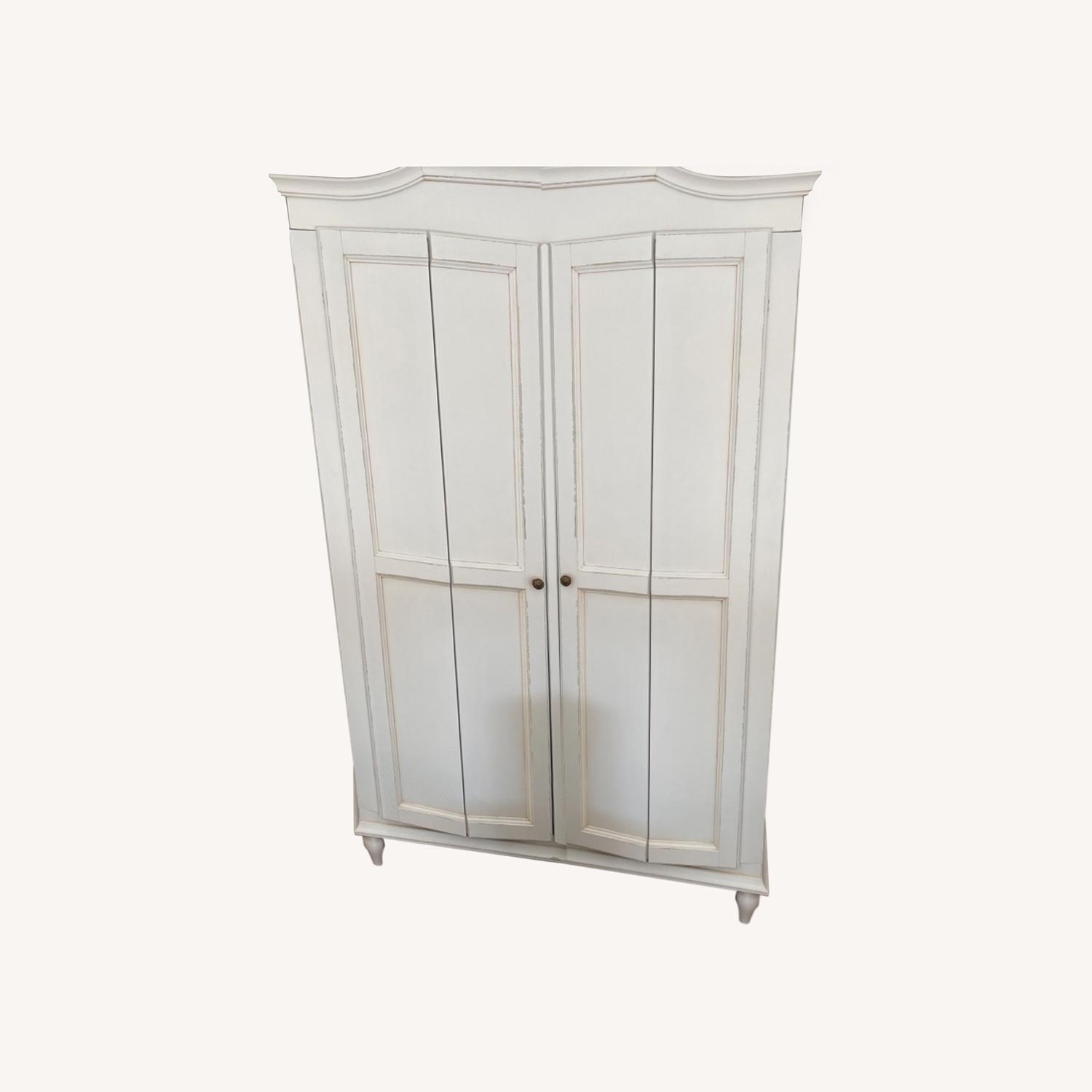 Seller's Notes:Ballard Designs white armoire with adjustable shelves and also comes with a clothing rack that can hold suit jackets. A 51” tv can also fit in the armoire. It’s a good alternate closet. I’m remodeling and won’t need it anymore. Sometimes you need the kind of storage armoire where you can close the doors and forget about it. Hand crafted in Italy with crown molding detailing and bulb feet, our Josephina Bonnet Top Armoire keeps clutter out of sight beautifully with multiple adjustable shelves and a fixed shelf behind bifolding paneled doors. Floating back panels provide cord management, so you can also use it as a media center. Part of our exclusive Casa Florentina collection, it's available in several hand-applied finishes. Skilled Italian artisans apply your custom finish in layers, distressing each one by hand using the same simple tools and techniques employed by Florentine artists for centuries. Josephina Bonnet Top Armoire features: Crafted in Italy of solid hardwood & fine veneers Removable hanging rod Storage for office, bedroom or living room Stocked and ready to ship Simple Assembly (screw off/on the feet) Dimensions: Overall: 78"H X 50 1/4"W X 21 1/4"D Space Above Fixed Shelf: 40 1/2"H X 42 1/2"W X 16 3/4"D w/2 Adjustable ShelvesBelow Fixed Shelf 2 Half Size Adjustable Shelves: 20 7/8"W X 16 3/4"D EachHanging Rod: 63 3/4"H X 1 3/16" DiameterLegs: 5"HCord management included above fixed shelf on left side & below in both cubbies Holds most TVs up to 51".
