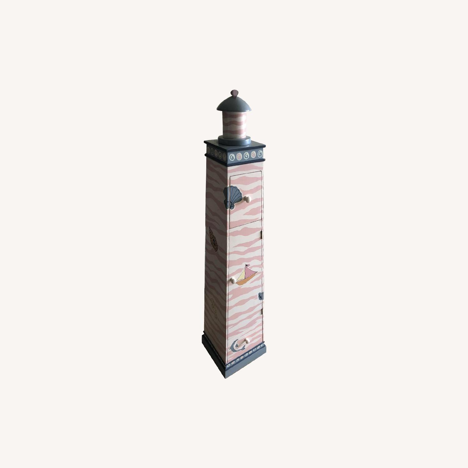 Seller's Notes:This special decorative and functional LIGHTHOUSE served as an imaginative piece for my daughters room who’s theme was magical princess mermaids . Light House Book Storage Cabinet girl/ boys room or Baby Nursery Furniture. Nautical theme Soft pinks, blues , gray, sailboat, sea horses, shells, concha Condition is pre-loved my daughter enjoyed this light house for along time she doesn’t want to let it go. It can hold small toddler books, diapers. , creams , Wipes etc. - one tiny Knick on the corner front door No odors, no stains, no broken pieces . Excellent condition