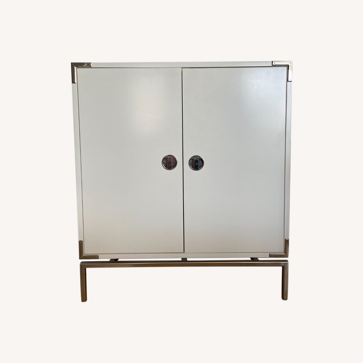 Seller's Notes:Sizeable white bar cabinet that holds wine bottles, glassware, and cocktail mixing gear. Features one cubby inside each door, storage for wine glasses, and a wine rack for 14 bottles.
