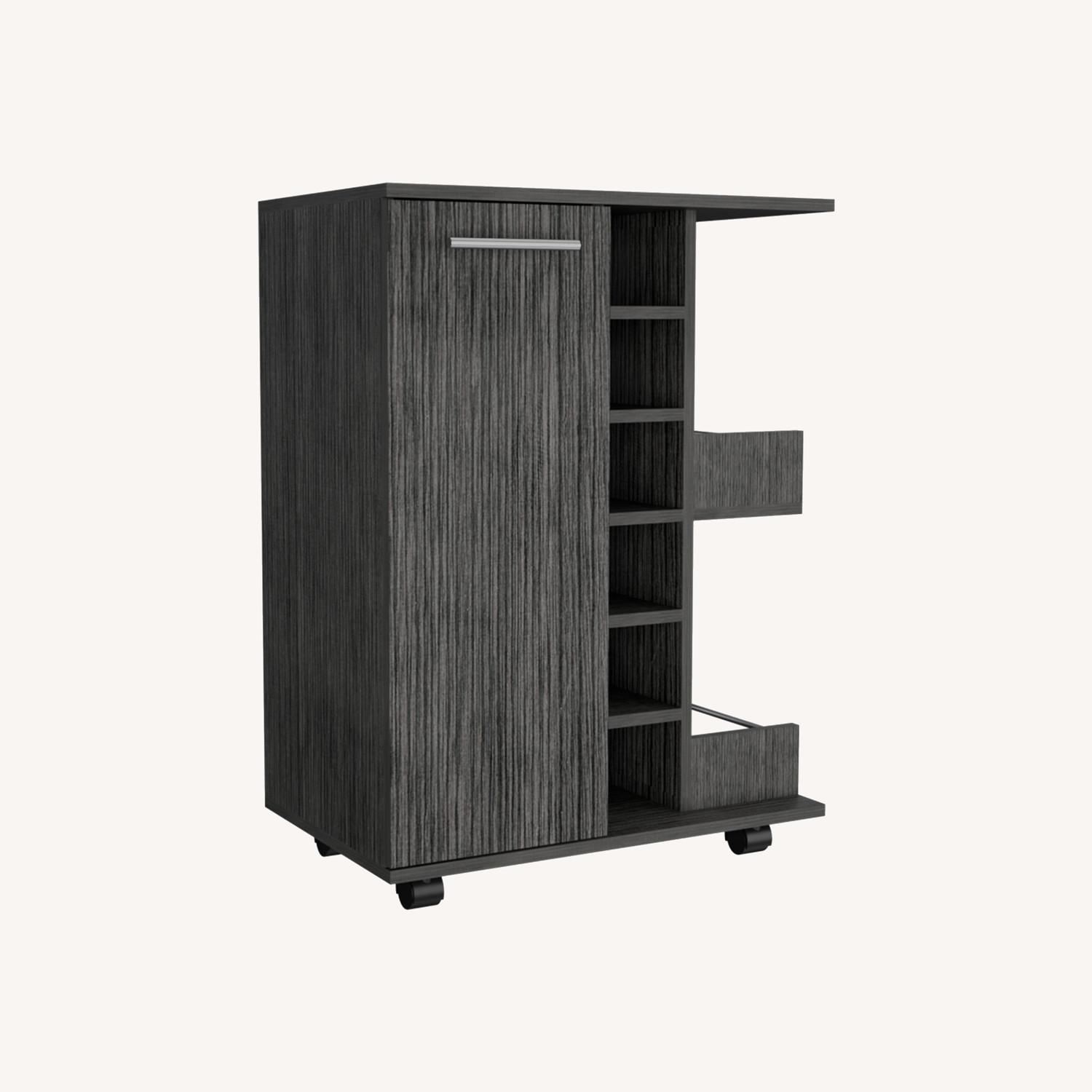 Seller's Notes:"Wells Bar Cart, share with your friends a drink that will always be a pleasure. The perfect bar cabinet its waiting for you. It features features a spacious cabinet with two enclosed shelves, two open liquor bottle shelves with rail guards, six liquor bottle cubbies, and casters with a locking system. Designed with elegant smoaky oak manufactured wood. Dimensions: Height: 32,32” Width: 23,62 Depth: 14,84“ Furniture Type: Ready to assemble (full assembly required).Certifications: CARB phase II compliant – TSCA Title VI Compliant.Warranty: 1-year warranty coverage in wooden parts- 1-year warranty coverage in hardware pieces since its manufacturing date is found in the lot number printed in the product box.Shipment details: Free shipping to the 48 contiguous states - delivery time: Between 2 and 5 days depending on the customer's location, season, and weather factors.Other details: This product does not include decorative or background elements; Check that the box is in good condition, and well packed, and check with the help of the manual that the corresponding parts have been included; For more information regarding warranty, shipment details, cancellations, returns & replacement parts go to the bottom section of our website to learn more; Installation & Assembly Instructions included."