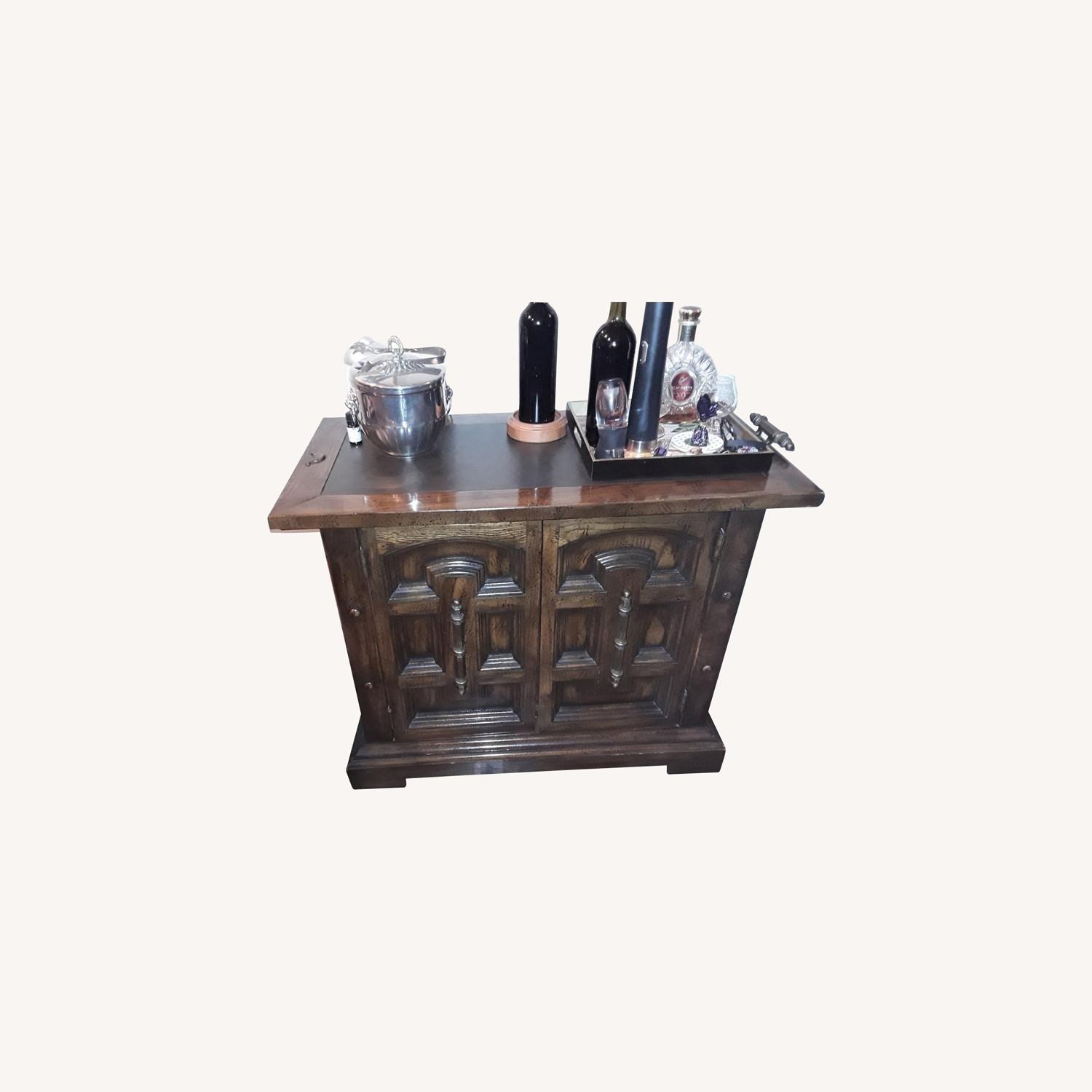 Seller's Notes:Wood bar server. Leather like insert type material. Side handle broken, but can be glued on. Solid wood.