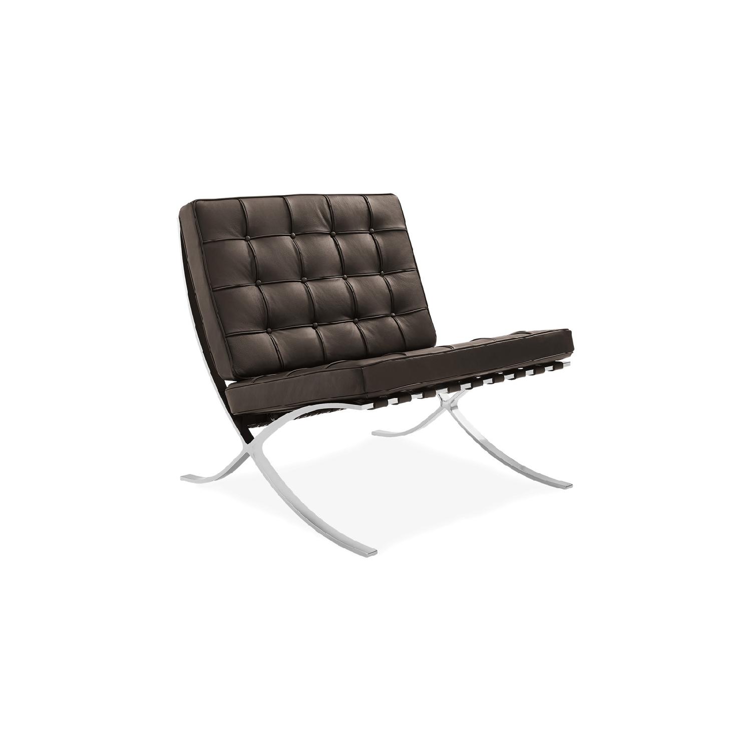 Seller's Notes:Barcelona Chair: Description: Available in full grain Italian leather, the Barcelona Chair Replica by Barcelona Designs needs little or no introduction. Built on a single piece of the highest quality unabridged stainless steel, the Barcelona Chair Replica ensures durability. The seat of Barcelona Chair Replica by Barcelona Designs is laid out at an angle creating a V - shape. Originally, designed by Ludwig Mies van der Rohe and Lilly Reich, this classic, often seen in movies, adorns hotels or big business establishments. The cushions eloquently rest on thick, high-grade cowhide saddle straps, which are color coordinated with the upholstery of the Barcelona Chair Reproduction. This ensures added comfort to the chair, yet making it look sophisticated. For supreme comfort, single panels of leather upholstering the cushion are cut, tailored and tufted by hand. Patterning this luxury, are panels and buttons which are designed using a single hide. Adding to the magnificence, the cushions are drafted in such a manner, that they adapt to the body of the person sitting on the chair. Features: • Meets architectural specifications of original design • Cushion surface features individually cut and sewn leather panels for optimum detailing and quality; full tufting of all appropriate seams • Heavy grade leather saddle straps color-match the upholstery; both sides of leather straps are finished for extra strength • The rear seat cushion edge features an angular contour cut to compliment the angle of the frame • The Barcelona Chair Cushions are made using High-Density Foam • Braided thread used with Lockstitch ensures piping stays in place and seams are long lasting • All visible corners on cushions are seamless for a more clean and finished appearance • Underseat vent allows air to flow in and out of the seat cushion with weight; this retains the density, shape and comfort of the cushion over time Dimensions: • Overall Height:31" • Overall Width:30 • Overall Depth:30" • Seat Height:17" Website: https://www.barcelona-designs.com/products/barcelona-chair-replica-mies-van-der-rohe-style?variant=31094891085