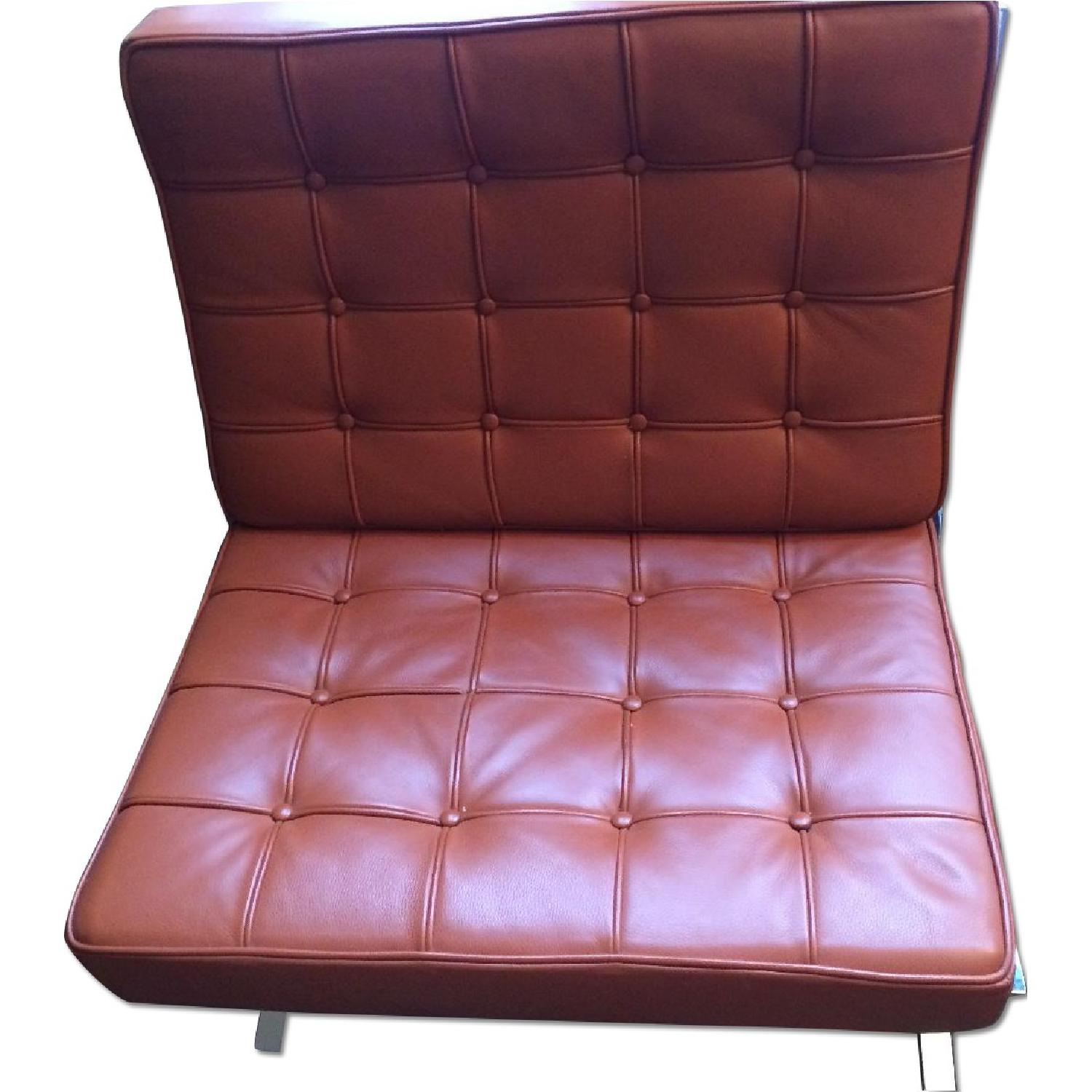 Seller's Notes:Amazing replica of the Mies Barcelona Chair, dimensions are almost exact!! The only dimension that is off is the overall height by 1/2" shorter. Overall dims: 30"l x 29.5w x 29.75"h. Seat height, width and length are exact to the dims of a Barcelona Chair. Leather straps on the back and under the seat cushion. Polished chrome frame/legs is in impeccable condition without even one scratch. Seat is a leather umber color and in great condition. We are redesigning and it is too large for the area we are looking to place a lounge seat.