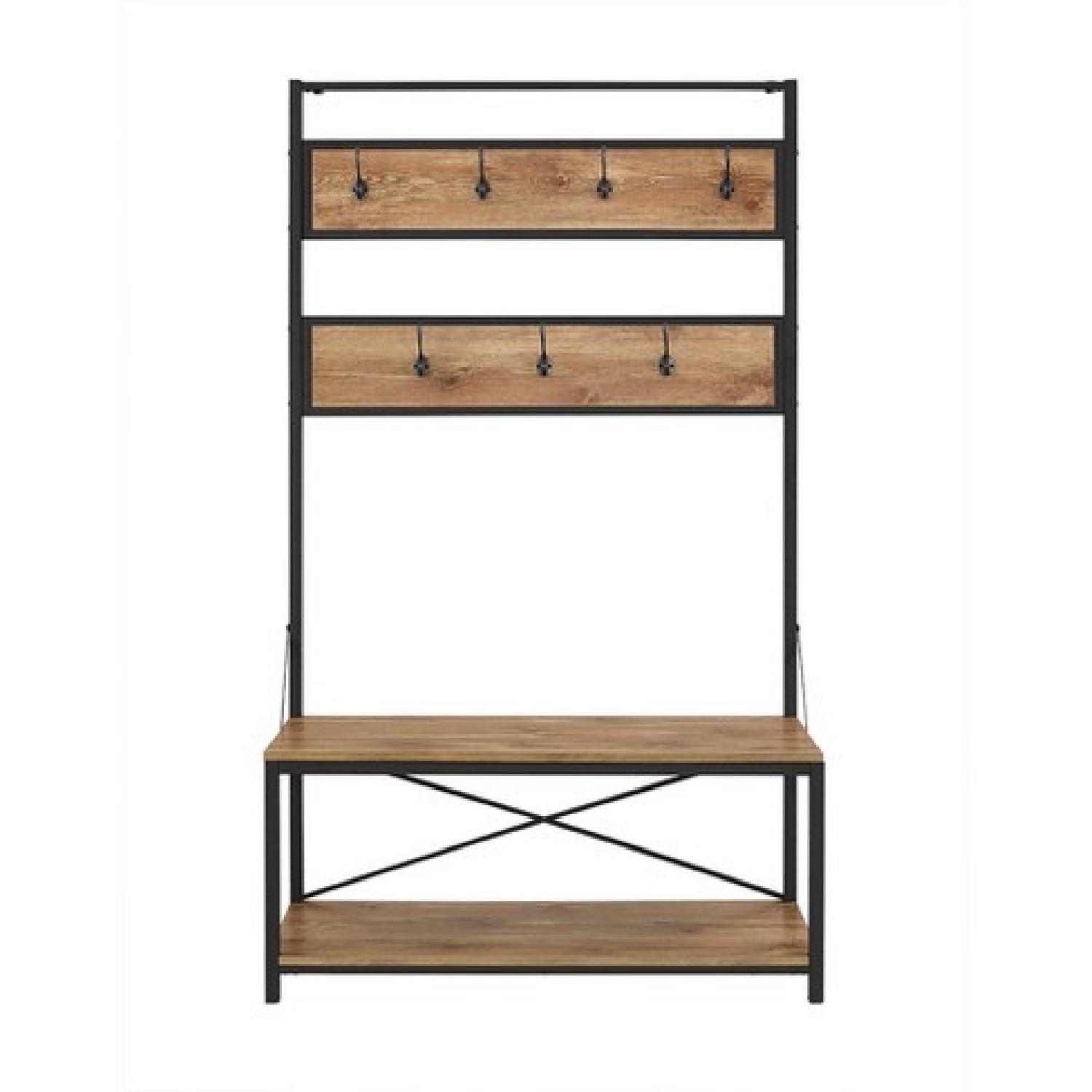 Seller's Notes:Description Keep your hallway tidy and organized with our industrial inspired design hall tree. Perfect to store all of your outdoor attire; hats, coats, shoes, or umbrellas. Keep your family's items off the floor to dry and easy to use. Beautifully designed and durably constructed, it's a wonderful addition to any home. Features: Dimensions: 72 in. H x 40 in. W x 17 in. L Powder coated Metal High-Grade MDF Multiple clothing hangers Convenient, spacious bench Open bottom storage space, perfect for shoes Durably constructed