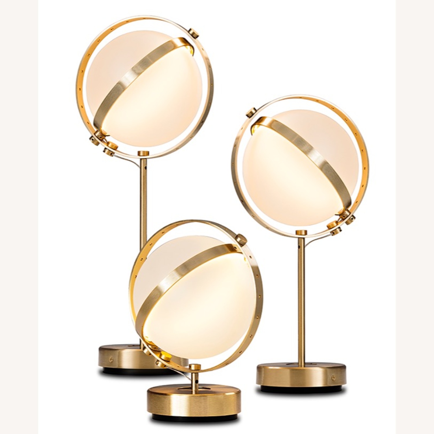 Seller's Notes:Italian brass finish table lamp consisting of a frosted glass globe surrounded by two concentric rings. The globe is illuminated by a strip of warm LEDs around the inner ring. Creates a warm, diffuse glow. Perfect as an accent piece or desk lamp. The lamp is dimmable if connected to a lamp dimmer (not included).