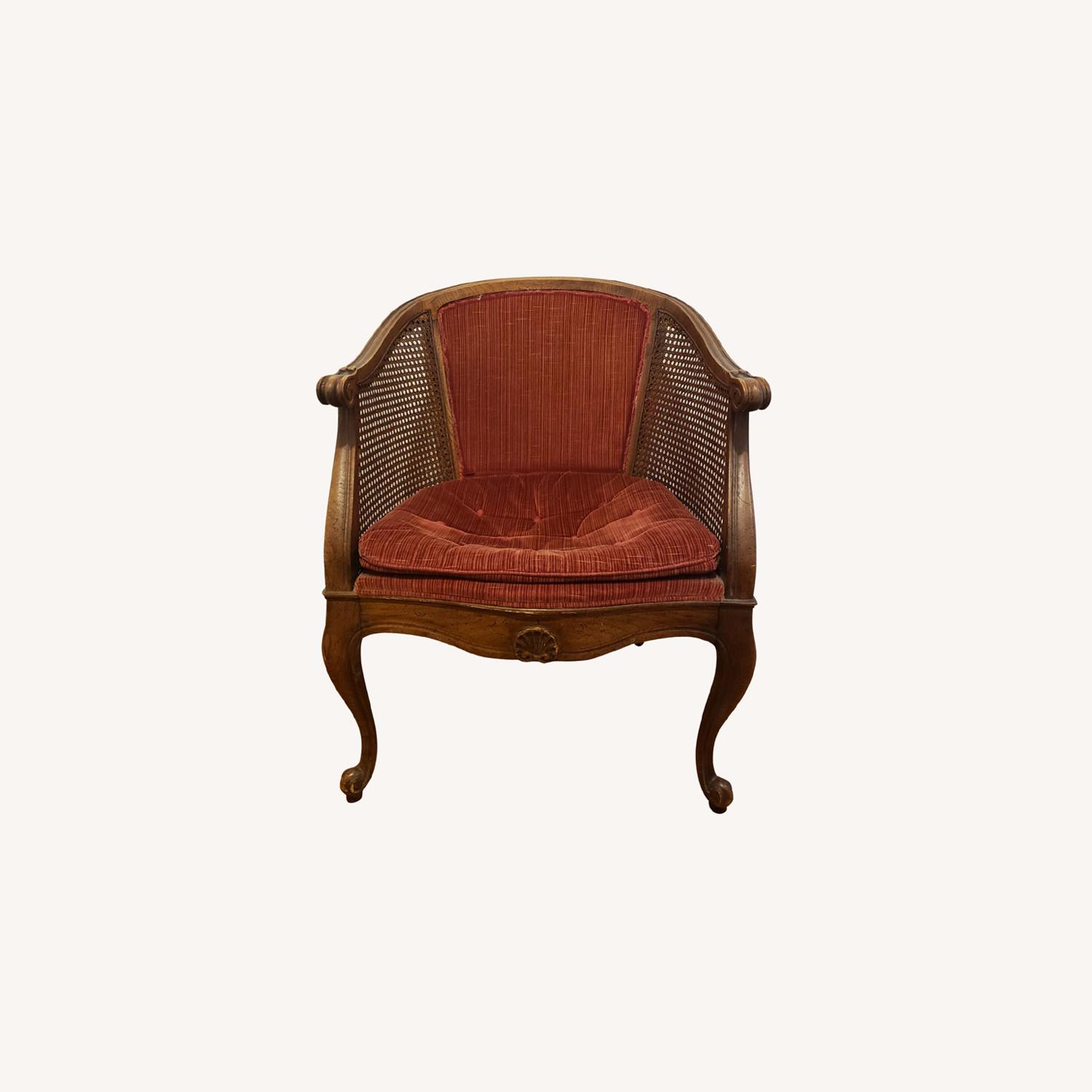 Seller's Notes:Two caned and tufted armchairs in velvet-like upholstery are available. This listing is for one chair. Measures 32" high x 24" wide x 24" deep. Seat at 18". Upholstery fabric in this accent chair is in good condition. However, trim was previously removed, see pictures. A refresh in fabric would give these chairs new life, but they are functional as is with no holes, stains or damage to fabric. The caning on the chair in this listing has come loose slightly, but it is not obvious unless pushed in from the side. It should be an easy repair. Very good vintage condition, sturdy and secure legs and seat. Comes from a clean, non-smoking, pet-free home.