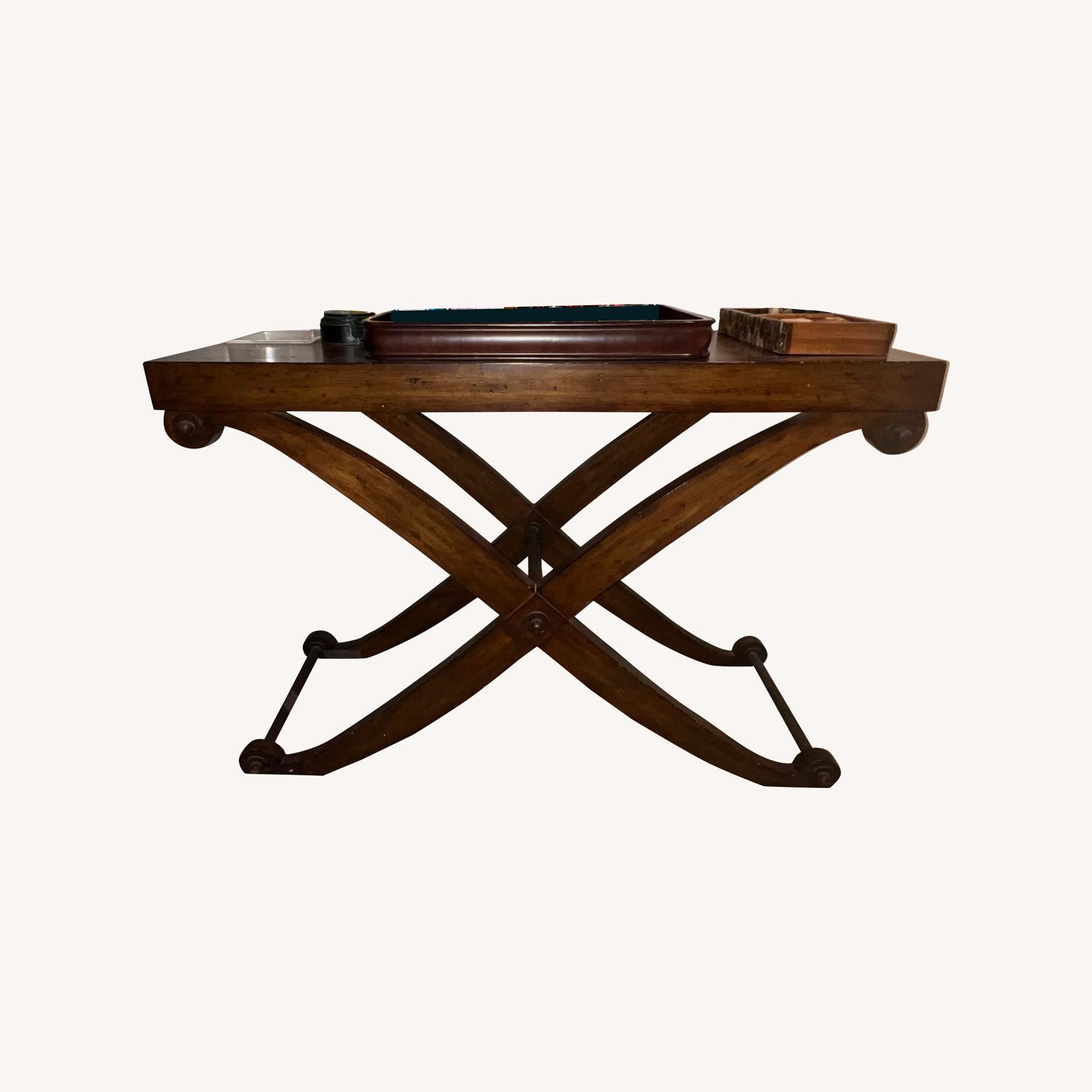 Seller's Notes:This is a lovely table for an apartment bar or console table. The x shaped legs are elegant and give it a light and airy feel .