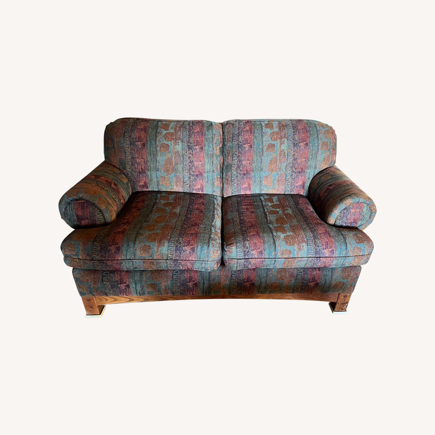 Seller's Notes:Southwest-style loveseat built by Bassett in excellent condition for sale. Fabric is completely intact and has green, gold and maroon coloring. Perfect for a desert home. Wood frame and legs. Loveseat is 58 inches long 38 inches high. This is furniture from a second home that is used less than 6 months out of the year, so is only very gently used.