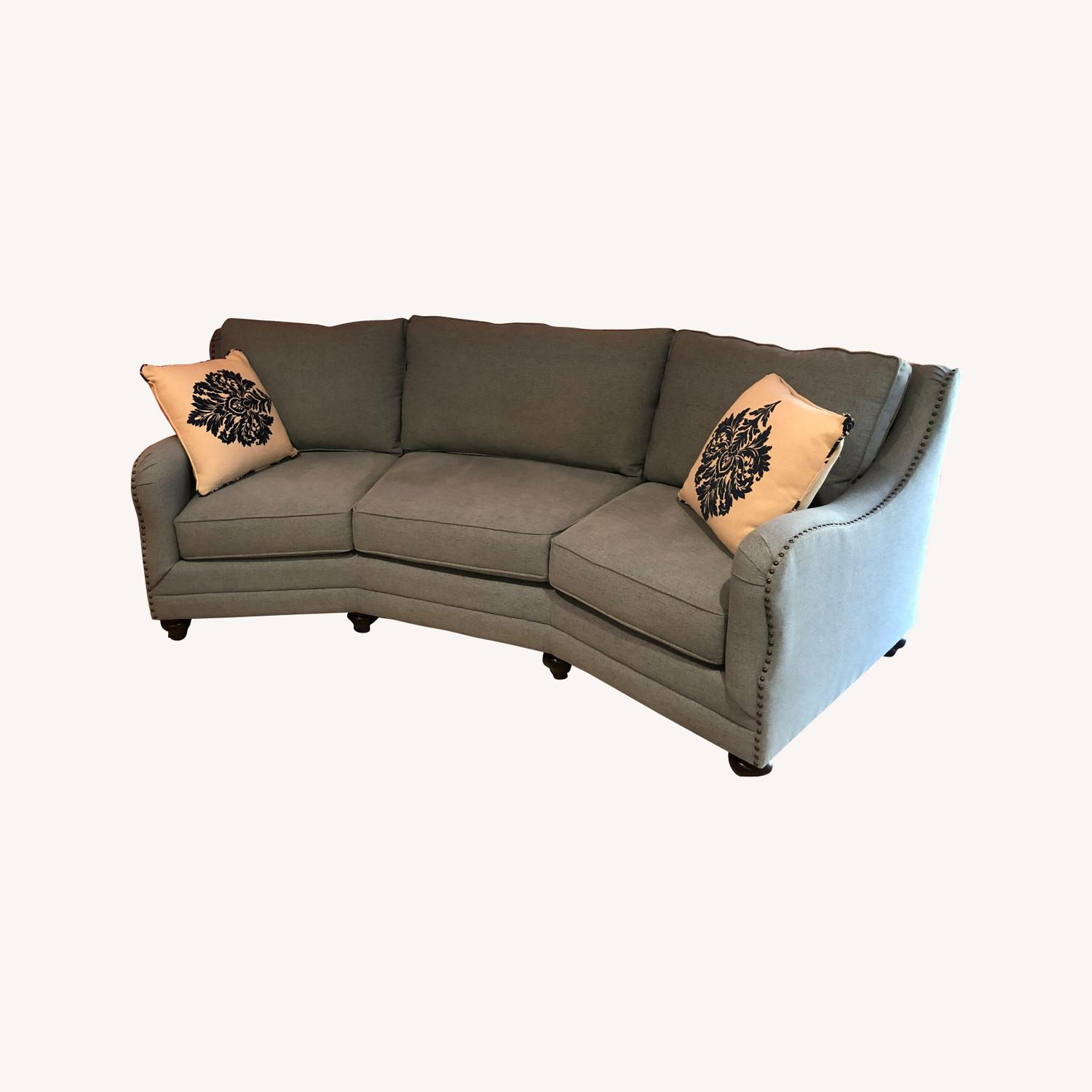 Seller's Notes:Large curved sofa in lovely blueish grey color custom made by Basset 4 years ago to enhance conversations in a large living room in our 100-year-old historic home in Salt Lake City. We relocated to Connecticut and are in a townhouse that is much too small. Professional cleaning crew cleaned twice a month. Excellent condition. Pillows included. Dimensions: Width across back - 108"; Width arm to arm: - 78"; Width back to front at widest point - 50"; Width from back cushion to front of seat 21 1/2"; Height floor to top - 36"
