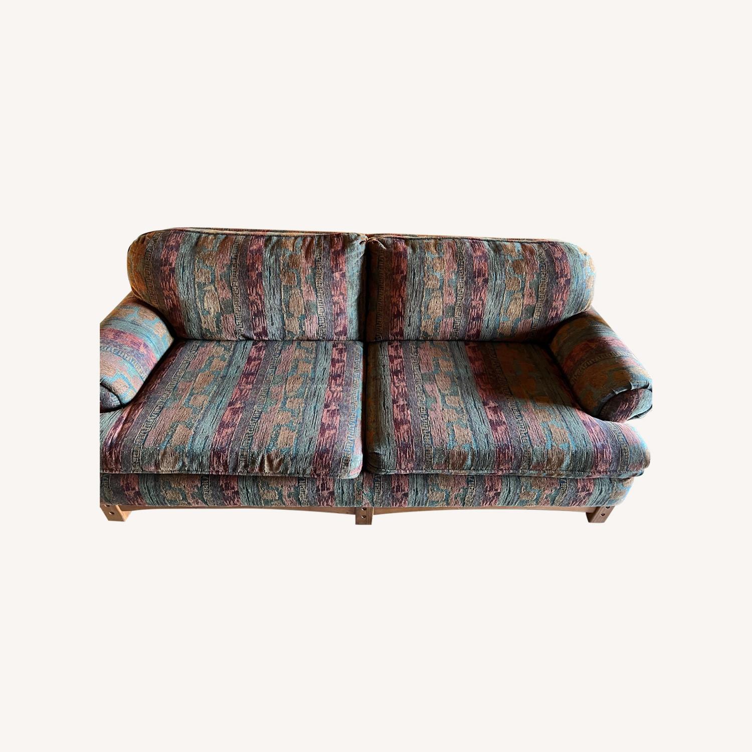 Seller's Notes:Less than 6 years old, this maroon/green/gold patterned couch is perfect Southwest decor. Solid wood frame and legs in excellent condition. Intact and pristine upholstery. This is furniture in a second home used less than half of the year so it is only gently used.