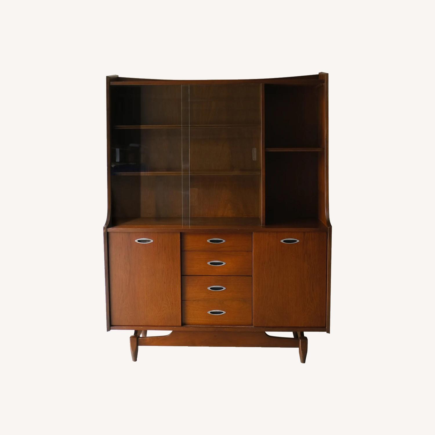 Seller's Notes:Vintage 1960s mid-century modern china, dining hutch display china cabinet by Bassett Furniture. Hutch features sliding glass doors and display shelves on the top, three drawers in the center of the bottom half flanked by sliding cabinet doors that open to storage space, sculpted stretcher base and legs, original metal pulls, original walnut finish. Amazing piece for storage. Great vintage condition with some signs of light wear consistent with age and use. We recently moved and it unfortunately no longer works in our new space. Local pick up available in elevator building. Message me for details! Materials: walnut, glass, walnut veneer, cabinets, shelves Width: 49.5 inches Height: 65.25 inches Depth: 15 inches Drawers: Top - 16”w x 11”d x 4.5”h Middle - 16”w x 11”d x 6”h Bottom - 16”w x 11”d x 11.25”h Cabinets: 15”w x 13.5”d x 21.5”h Right cabinet has a fixed shelf in the center, 10 in height above and below the shelf.