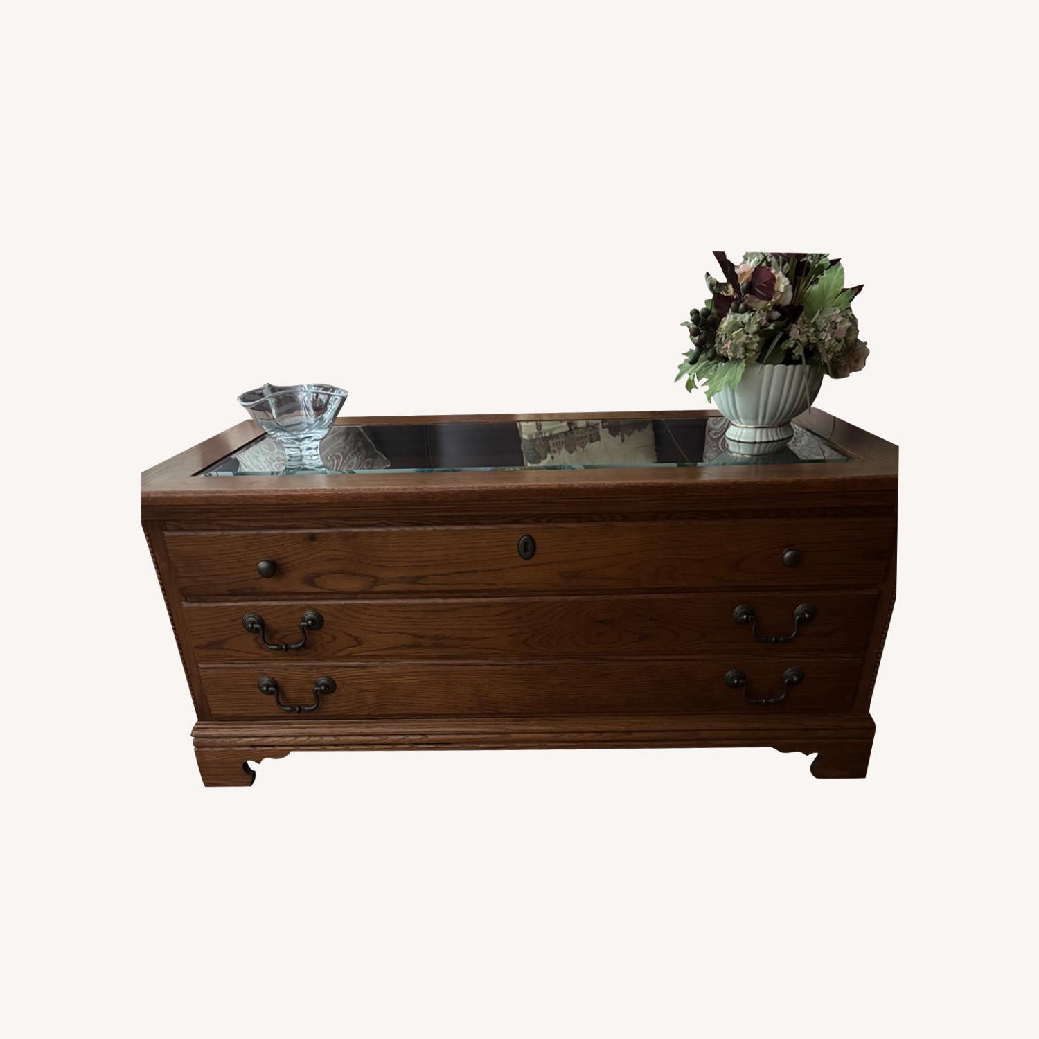 Seller's Notes:Beautiful wood coffee table with glass display top. Large storage drawer. Perfect condition. Look for coordinating end table listed separately.